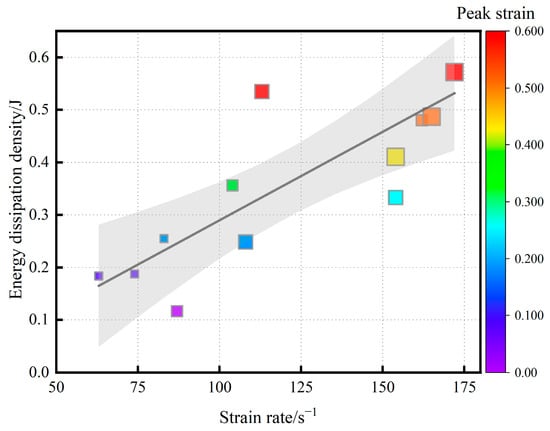 As shown in Figure 8, the color scale on the right side indicates the peak strain of concrete specimens of different grades, and the energy dissipation density increases with strain rate for all concrete specimens of different grades. Strain rate as a measure of the strength of the dynamic impact process of the specimen, with the increase in the impact load, the specimen will show an increase in the energy dissipation mechanism, specifically, concrete specimens in the increasing strain rate loading, and the damage process that is manifested in the development of the development of micro-cracks to the local crushing. The dynamic damage process described above is characterized by the fact that concrete specimens with higher energy dissipation densities have correspondingly higher peak strains, and their damage accumulation process is more extensive and fuller. At similar loading strain rates, the energy dissipation density of higher grades is basically greater than that of lower grades, especially at higher strain rates.