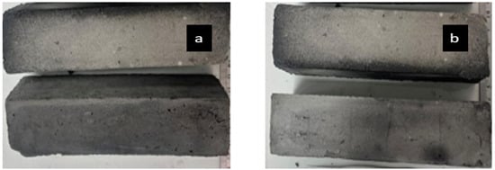 Appearance of ceramic bricks produced using different types and contents of metallurgical dust additives: (a) bricks with 20% and 25% lead furnace dust; (b) bricks with 20% and 25% cyclone dust, respectively.