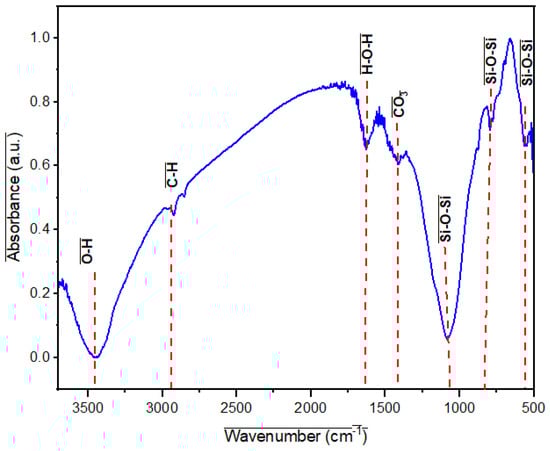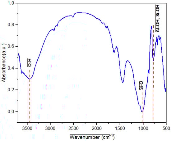 Clay Loam. Figure 4 shows the FTIR spectrum of the clay loam. The broad band in the 3600–3200 cm−1 region corresponds to O–H stretching vibrations of kaolinite, montmorillonite, and structurally bound water. A strong absorption at 1000–1100 cm−1 reflects Si–O stretching within aluminosilicate frameworks, indicating the presence of quartz and layered clay minerals. The bands at 800–600 cm−1 arise from Al–OH and Si–OH bending vibrations typical of phyllosilicates, confirming that the clay is dominated by aluminosilicate phases that form the primary structural matrix of the ceramic body [34,36].