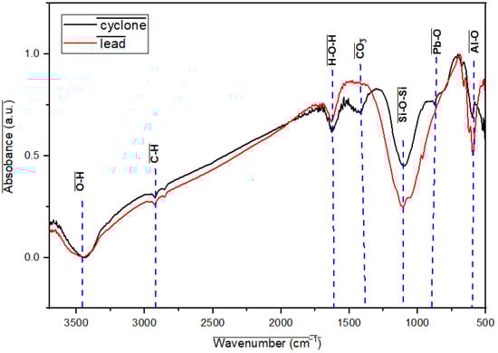 The strong absorption at 1080–1090 cm−1 is associated with Si–O–Si stretching, suggesting the presence of siliceous particles or secondary silicate phases formed during volatilization of the charge. The absorption band in the 600–900 cm−1 region is a superposition of several vibrational modes, including contributions from Pb–O and Zn–O bonds, as well as Fe–O and Si–O–(Al) bending vibrations typical of complex oxide and aluminosilicate systems present in metallurgical dusts. Of particular relevance are the deformation vibrations in the 600–900 cm−1 region, which are characteristic of Pb–O and Zn–O bonding and reflect the presence of PbO, Pb3O4, ZnO, and mixed oxide species typical of Pb–Zn smelting residues [33,35]. A signal near 520 cm−1 is attributed to aluminosilicate fragments entrained during dust formation.