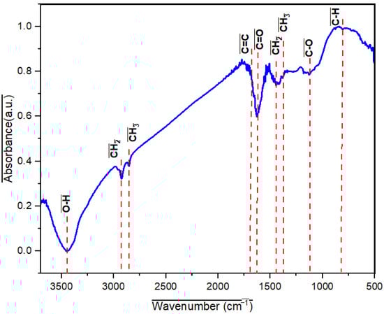 Strong absorptions in the 1700–1600 cm−1 region originate from carbonyl (C=O) and aromatic C=C stretching [33], while the band at ~1450 cm−1 reflects CH2/CH3 deformation vibrations. The 1200–1000 cm−1 region is associated with C–O stretching in alcohols, ethers, and phenolic compounds. Out-of-plane aromatic C–H bending at 700–900 cm−1 indicates a polycyclic aromatic structure typical of medium-rank coals [37].