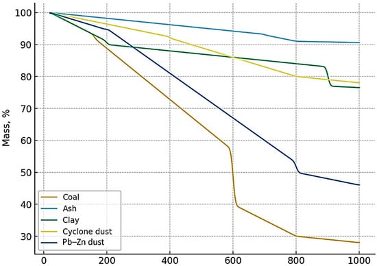Figure 6 presents the TGA curves of bituminous coal, fly ash, clay loam, lead furnace dust, and cyclone dust (P-3).