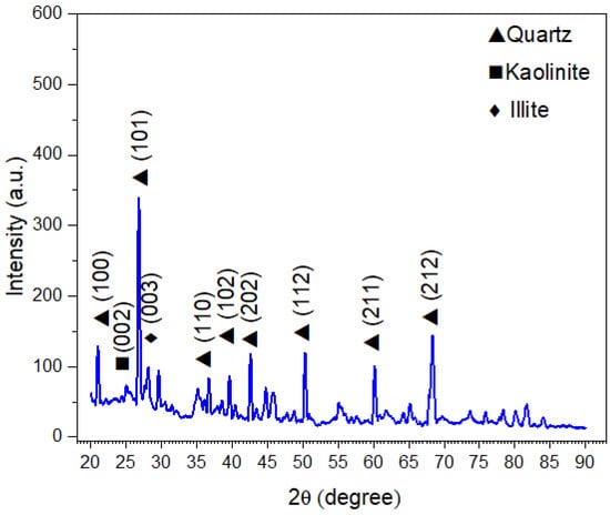 Clay soils. The XRD pattern of the clay soils (Figure 7) is dominated by quartz, which exhibits its characteristic reflections at 2θ = 20.8° (100), 26.6° (101), 36.5° (110), 39.8° (102), 50.1° (112), 59.9° (211), and 68.2° (212). A weak diffraction maximum at 2θ ≈ 24.9°, corresponding to kaolinite (002), is also observed, indicating the presence of residual kaolinitic components in the raw clay [42]. In addition, a minor shoulder near 2θ ≈ 26.9° is attributed to the illite (003) reflection, which partially overlaps with the intense quartz peak at 26.6°.