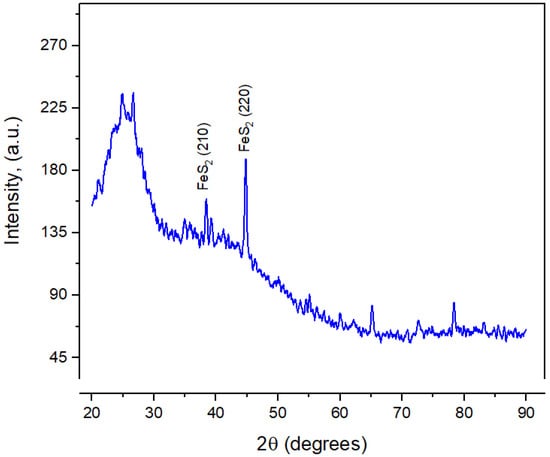 Only two weak yet distinguishable diffraction peaks are observed, corresponding to pyrite (FeS2) [44]. These reflections appear at approximately 36–38° 2θ (210) and 46–48° 2θ (220), confirming the presence of minor crystalline sulfur–iron inclusions naturally occurring in coal.