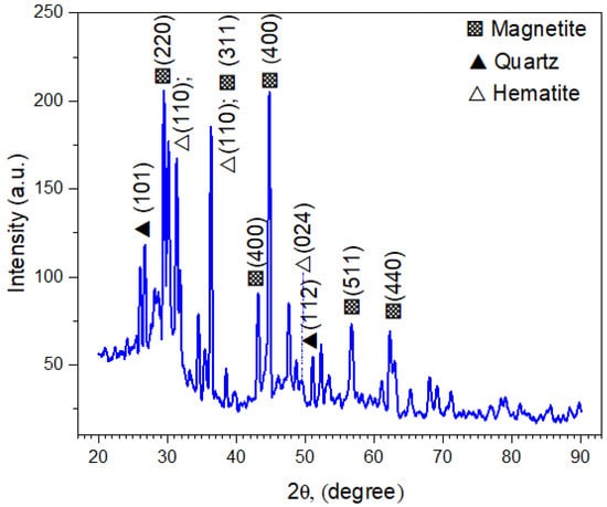 The XRD pattern of the fly ash (Figure 9) shows the presence of quartz (SiO2), magnetite (Fe3O4), and hematite (Fe2O3), which are the typical crystalline phases found in coal-derived fly ash. Quartz is identified by its characteristic reflections at 20.9° (100) and 26.6° (101), with a weaker reflection at 50.1° (112). Hematite is confirmed by the peaks at 33.2° (104), 35.6° (110), and 54.1° (116). Magnetite is clearly identified by the most intense reflection at 43.1° (400), along with additional peaks at 30.1° (220), 35.4° (311), 57° (511), and 62.5° (440).