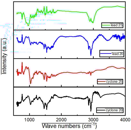 The FTIR spectra of the dusts contain characteristic absorption bands in the 600–900 cm−1 region, corresponding to Pb–O and Zn–O vibrations. These bands are typical for oxide and mixed oxide species formed in Pb–Zn metallurgical residues and are widely reported in the literature. Therefore, the presence of heavy-metal ions (Pb and Zn) in the raw dusts is supported by both our FTIR results and previous studies.