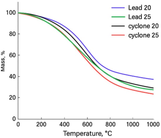 The dust fractions differ in composition and thermal behavior. Cyclone dust—high residual mass (mineral phase) and a shift of the T_peak to higher temperatures, indicating low volatility. Radiation dust—a weak low-temperature peak (200–400 °C) and a broad carbon oxidation peak at 500–800 °C, reflecting a high proportion of fixed carbon [41].
