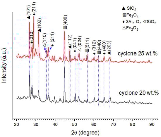 Figure 15 shows the XRD patterns of the fired bricks incorporating 20 and 25 wt.% cyclone dust. The dominant crystalline phases in both samples are quartz (SiO2), mullite (3Al2O3·2SiO2), and iron oxides (Fe2O3 and Fe3O4). Quartz is represented by its characteristic (101) and (102) reflections, while iron oxides are identified through Fe3O4 (400), (511), (440) and Fe2O3 (104), (110), (024) peaks.