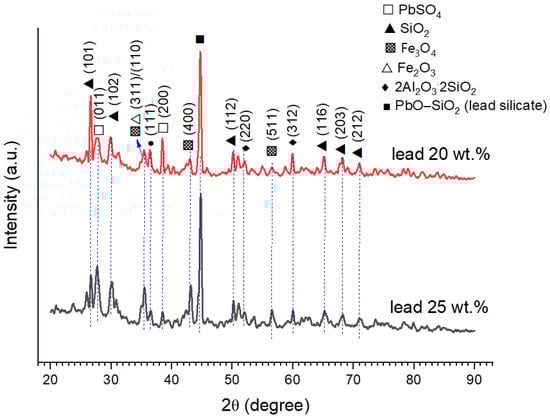 A distinct peak near 44.7° 2θ in the 20 wt.% sample indicates the formation of Pb–Si–O phases originating from the interaction of PbO with amorphous silica. The higher-residue sample (25 wt.%) exhibits a broader amorphous halo and reduced intensity of crystalline reflections, consistent with the development of a more extensive silicate–oxide glassy matrix incorporating Pb- and Fe-bearing species.