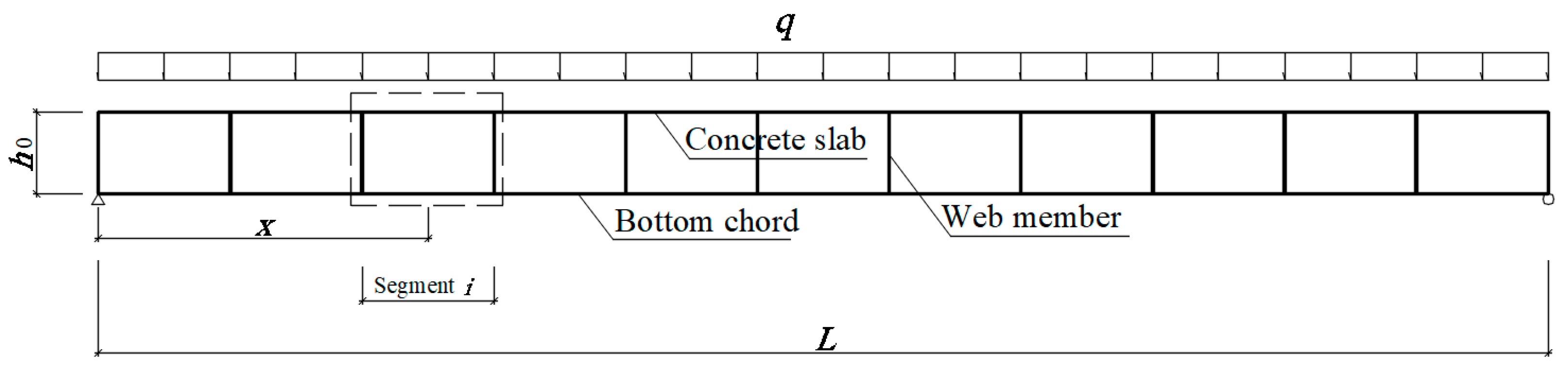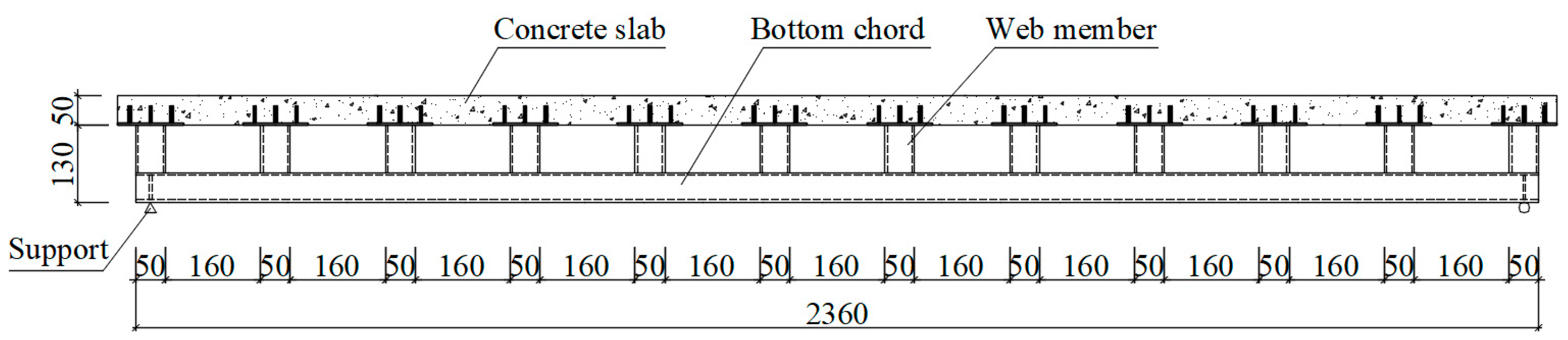 - Xu, J.; Zhu, Y.; Wang, Q.; Xu, Y.; Chen, R.; Ma, R. Flexural behavior of open-web composite slab with I-shaped steel bottom chord and vertical flat webs. Structures 2023, 58, 105434. [Google Scholar] [CrossRef]