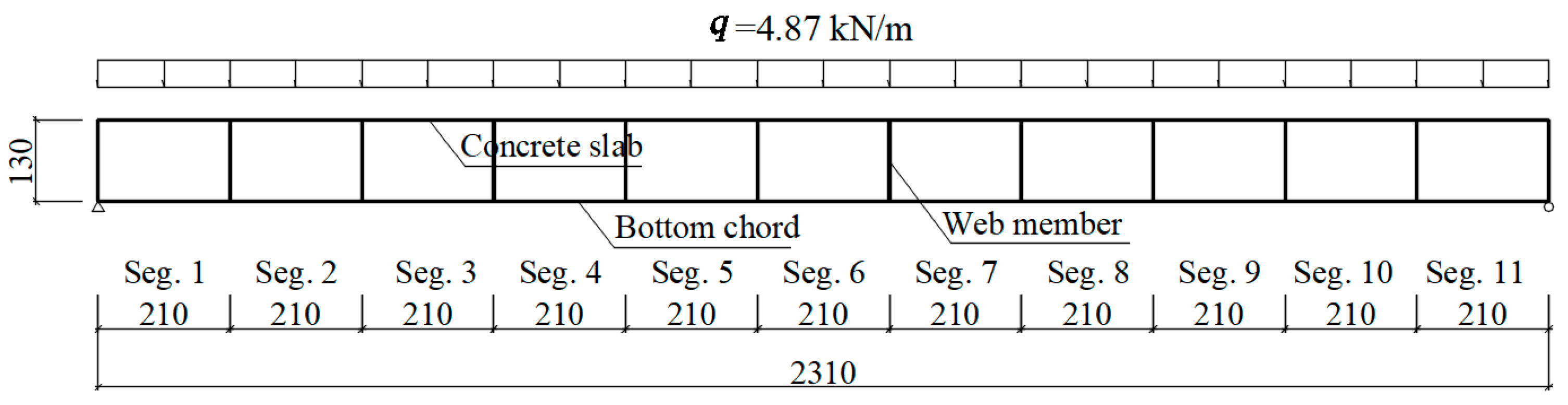 | Bottom Chord | Left end of segment 1 | Right end of segment 2 | Left end of segment 1 | Segment 6 (mid-span) |