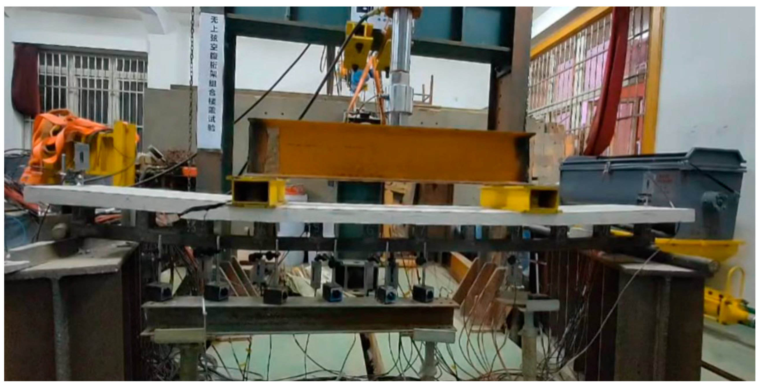 - Yu, F.; Ma, K.; Yuan, B.; Liu, Z.; Guo, Y.; Wang, Y. Experimental Study of a New Assembled Integral Concrete–Steel Open-Web Sandwich Plate Composite Bridge. Eng. Struct. 2022, 272, 115018. [Google Scholar] [CrossRef]