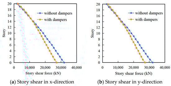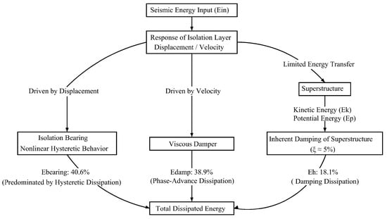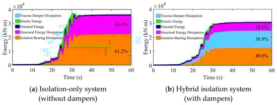 - Adding viscous dampers to the isolation layer significantly altered the distribution of structural dynamic responses. Story shear forces decreased variably across Floors 1–15 (with a peak reduction of ~17% at the isolation layer) but increased above Floor 15 due to higher-mode effects. Concurrently, the energy dissipation ratios of isolation bearings decreased from 61.2% to 40.6%, and those of the superstructure from 36.8% to 18.1%, which effectively mitigates cumulative plastic damage in both components.
