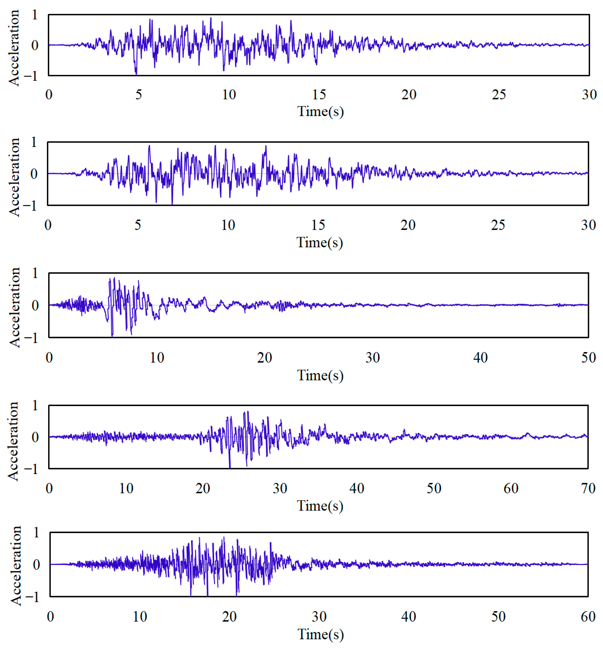 | Time History Record | First Arrival Time at 10% of Peak Acceleration (s) | Last Occurrence Time at 10% of Peak Acceleration (s) | Effective Duration (s) | Fundamental Period (s) | Ratio |