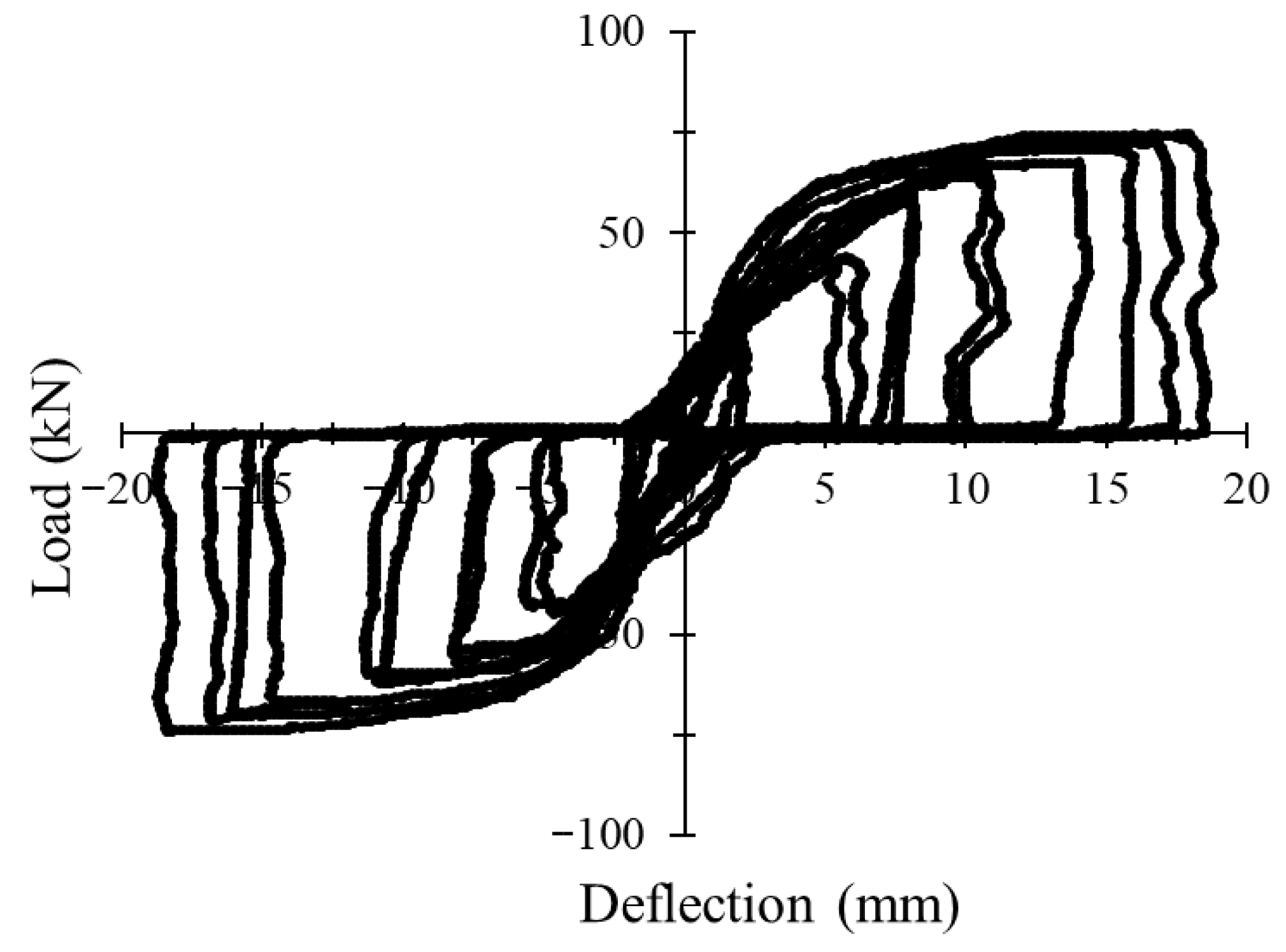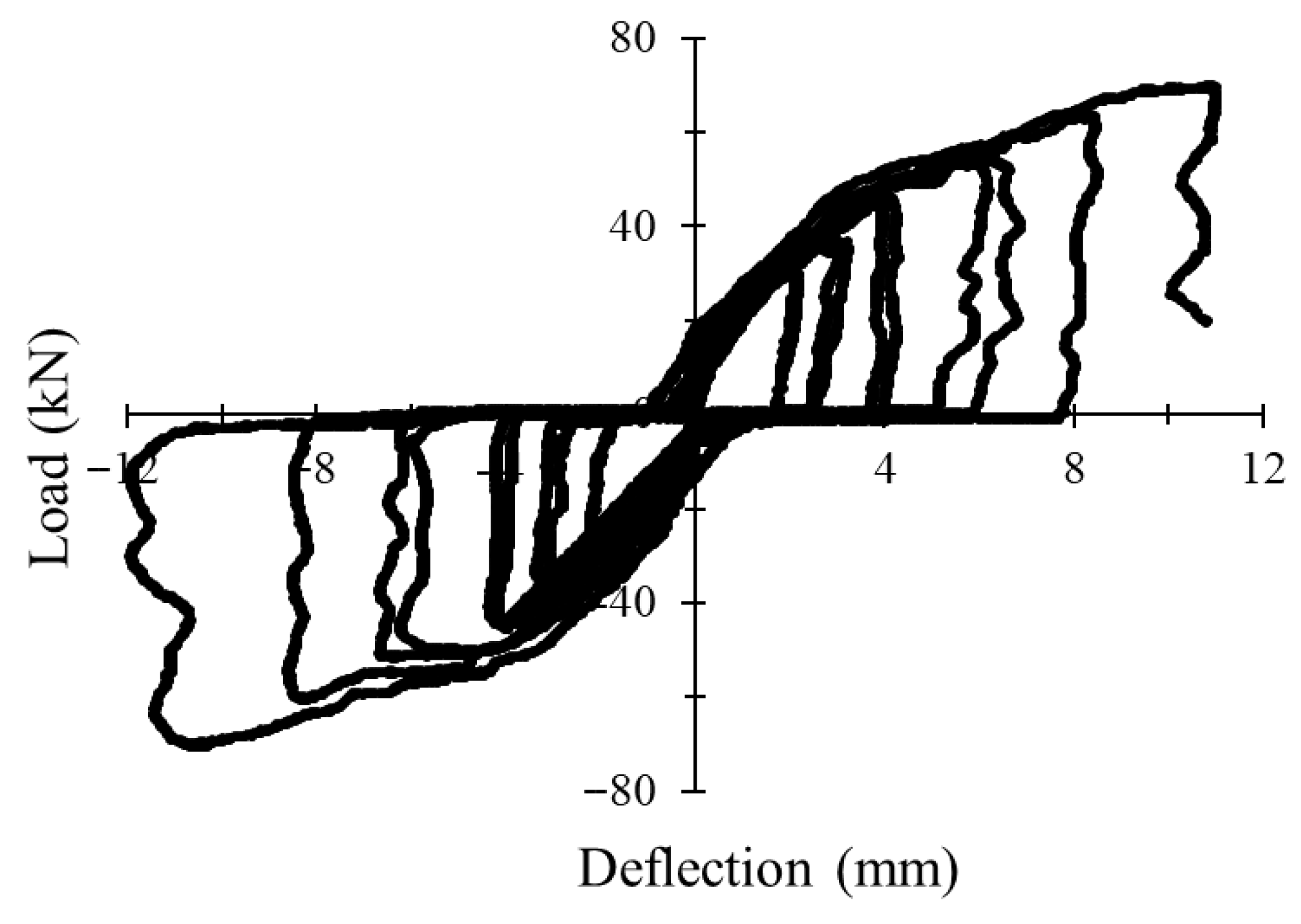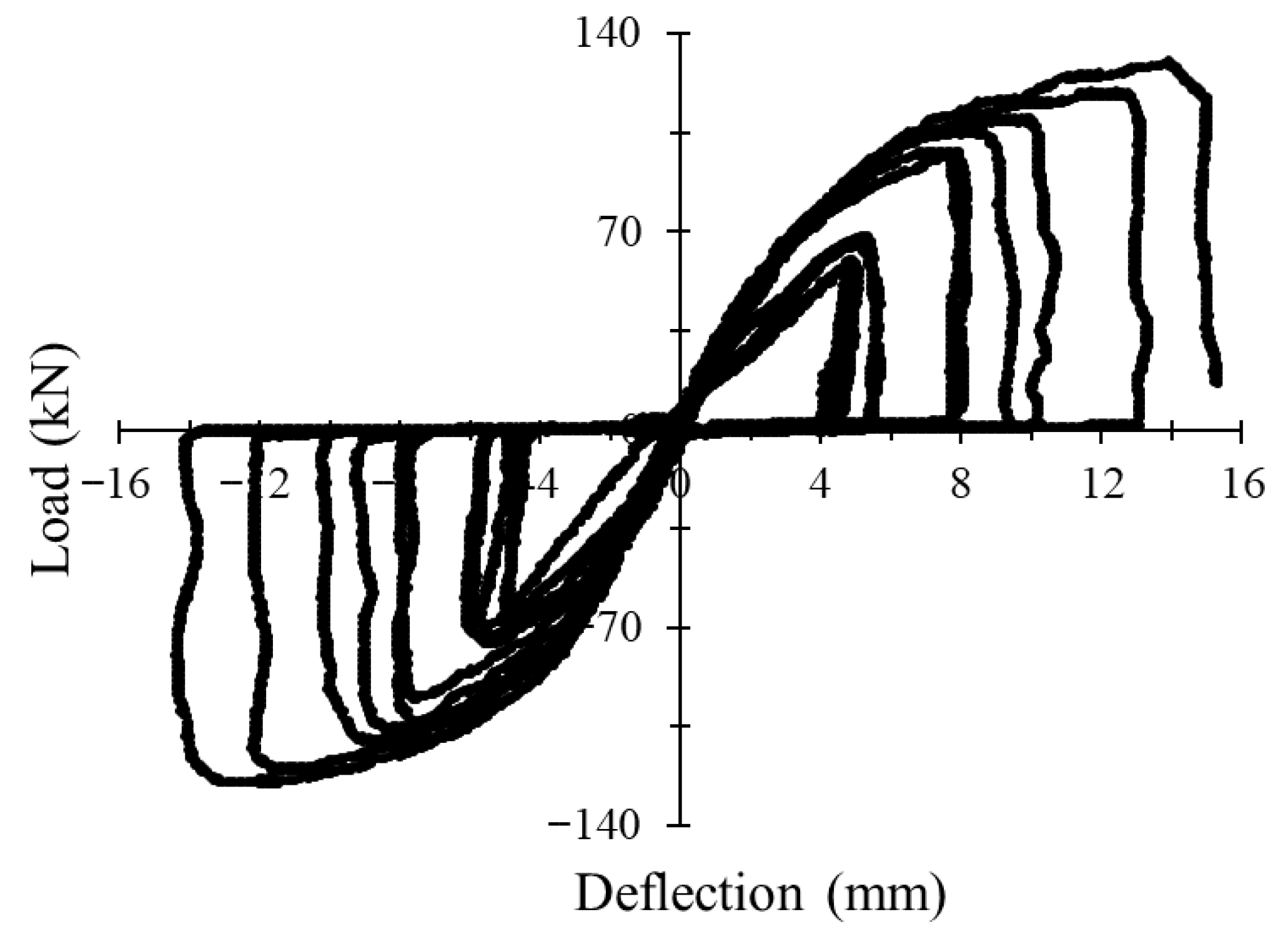 3.1. Load–Deflection Behavior Under Monotonic and Cyclic Loading