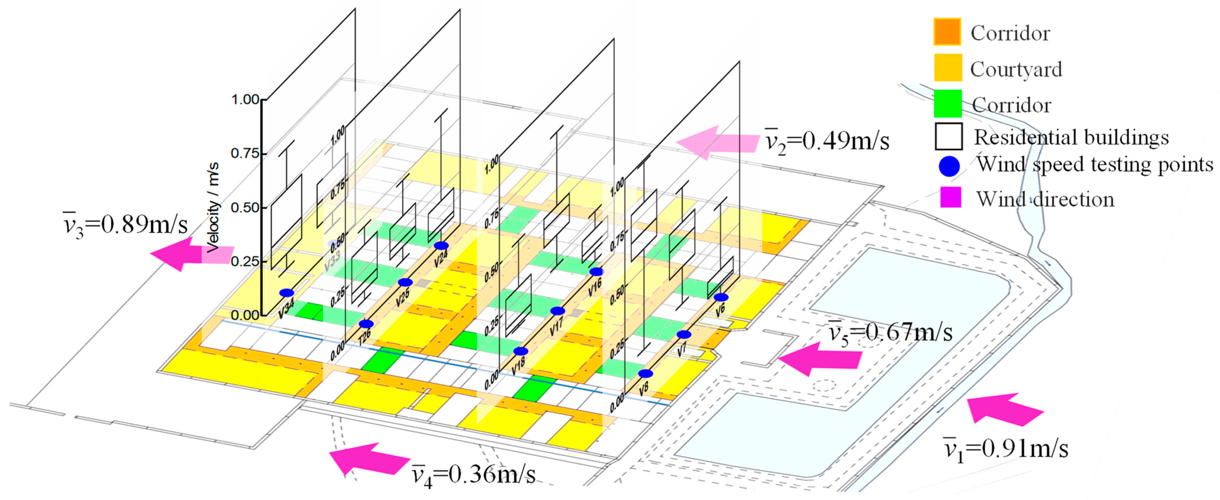 - In summer, when the air velocity at the gate entrance reaches up to 1 m/s, the air velocity in this courtyard varies from 0.25 m/s to 0.75 m/s, which is comfortable for living. This indicates that patio design can effectively reduce the interference of outdoor air velocity on indoor air velocity.