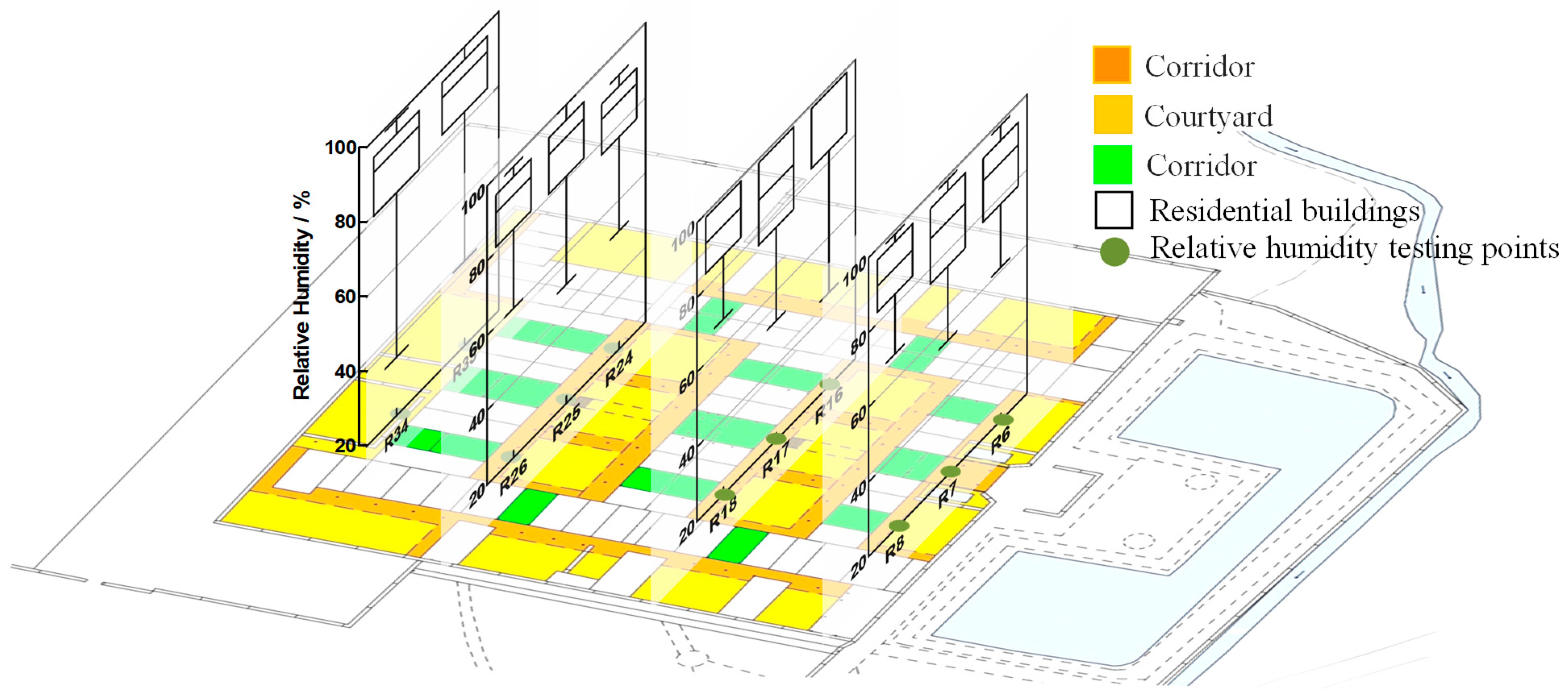 - When the outdoor ambient temperature reaches as high as 34.5 °C, the average temperature in the patios is 27 °C and the indoor air temperature is 26.7 °C. A cooling effect can be achieved through natural ventilation via the water pool at the front of the courtyard. Furthermore, the energy-saving rate of ventilation is 26.2%.