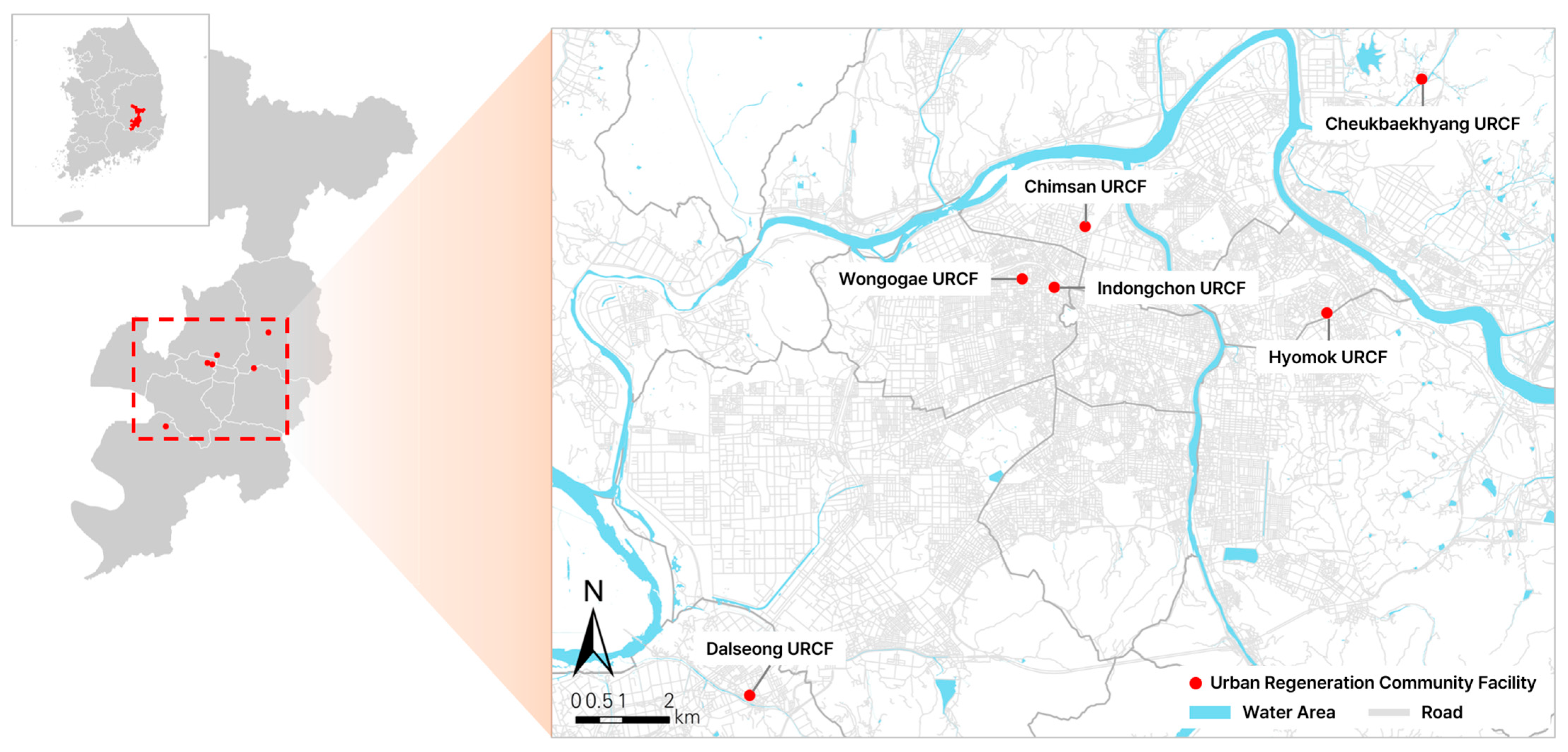 - Special Act on the Promotion and Support for Urban Regeneration; Act No. 11965; Government of the Republic of Korea: Seoul, Republic of Korea, 2013.