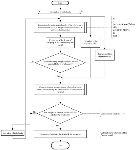 Steel structures quickly lose stability during a fire, which is why fire protection measures are used to increase their fire resistance limits. Structural fire protection in the form of boards or covers can achieve structural stability values ranging from 30 to 240 min under various fire conditions. Structural fire protection has certain advantages—it does not change its geometry during a fire, its behavior is predictable during testing (unlike intumescent fire protection), it has broad climatic applicability, and it can achieve high fire resistance limits. This article presents a mathematical model that calculates the minimum cost of structural fire protection while ensuring that the unexposed side of a steel column does not exceed 500 °C and achieves 180 min of standard fire resistance. Optimal values were extracted using genetic algorithms in the MS Excel environment and the “Solver” tool. The model was tested on a sample of 39 structural materials, such as cement boards, covers, and enclosures. The calculated coefficient of determination (R2) for the predictive model of the main component was 0.948. The predicted material cost was 6.83 $/m2. This study’s results can be used for preliminary cost estimation of fire protection treatments for steel structures in large design and operating companies.