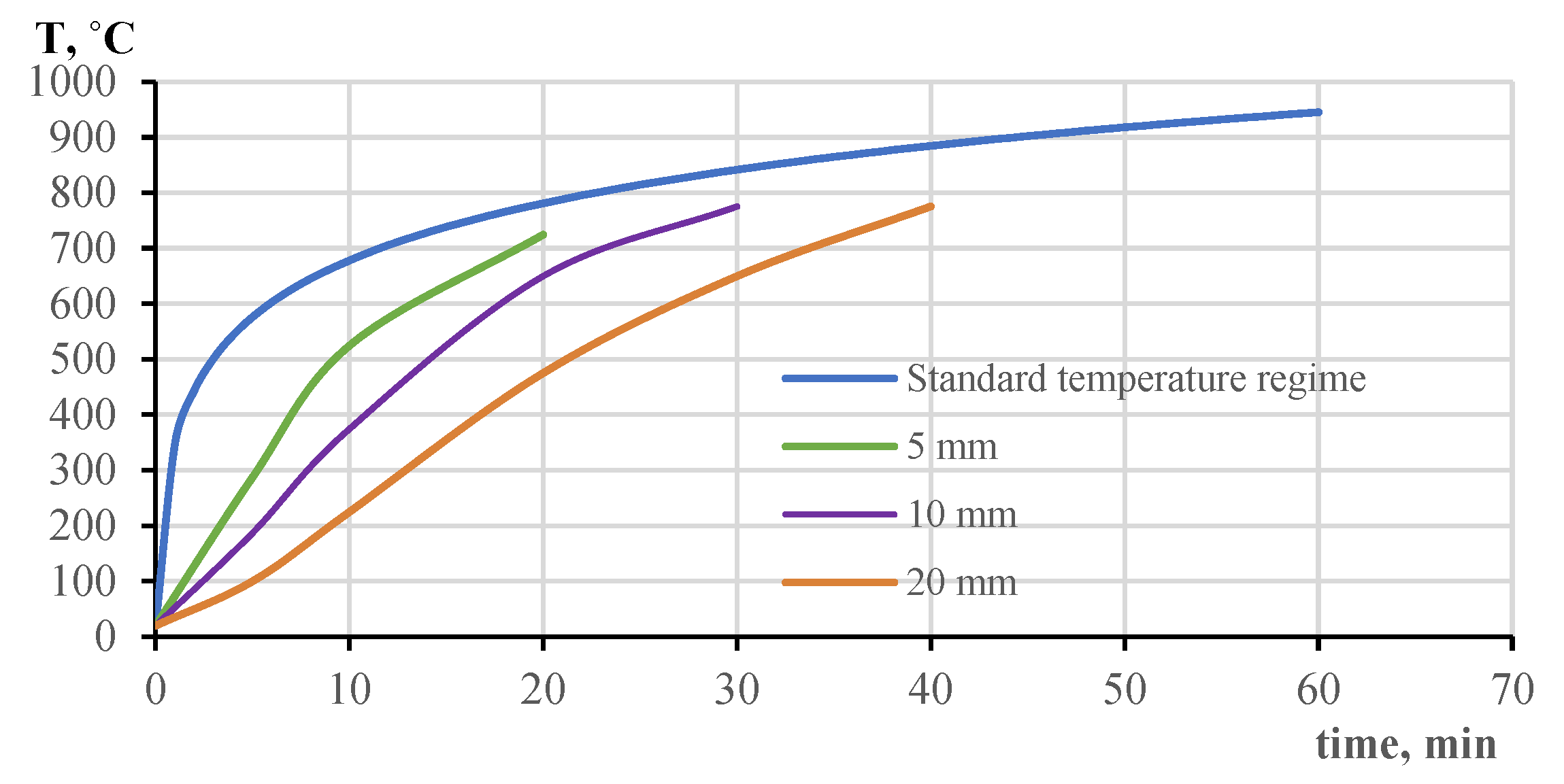 To understand the resistance of such structures to fires, standard testing methods are carried out under the cellulose fire mode according to ISO 834 [1] (the fundamental world standard for fire resistance testing, which is why this mode is also called “standard” (S)). Modern software packages implementing a field fire model also simulate the “real” fire mode, which can be obtained based on the combustible load at the facility [2,3]. As can be seen from Figure 2, under the standard temperature mode, the temperature increases according to a logarithmic curve; after 5 min, the heat flow is 25 kW/m2 [4]. Figure 3 shows a graph of the combustion mode of hydrocarbons and the fire resistance curves of steel plates under this mode; the heat flow is 50 kW/m2 [5].