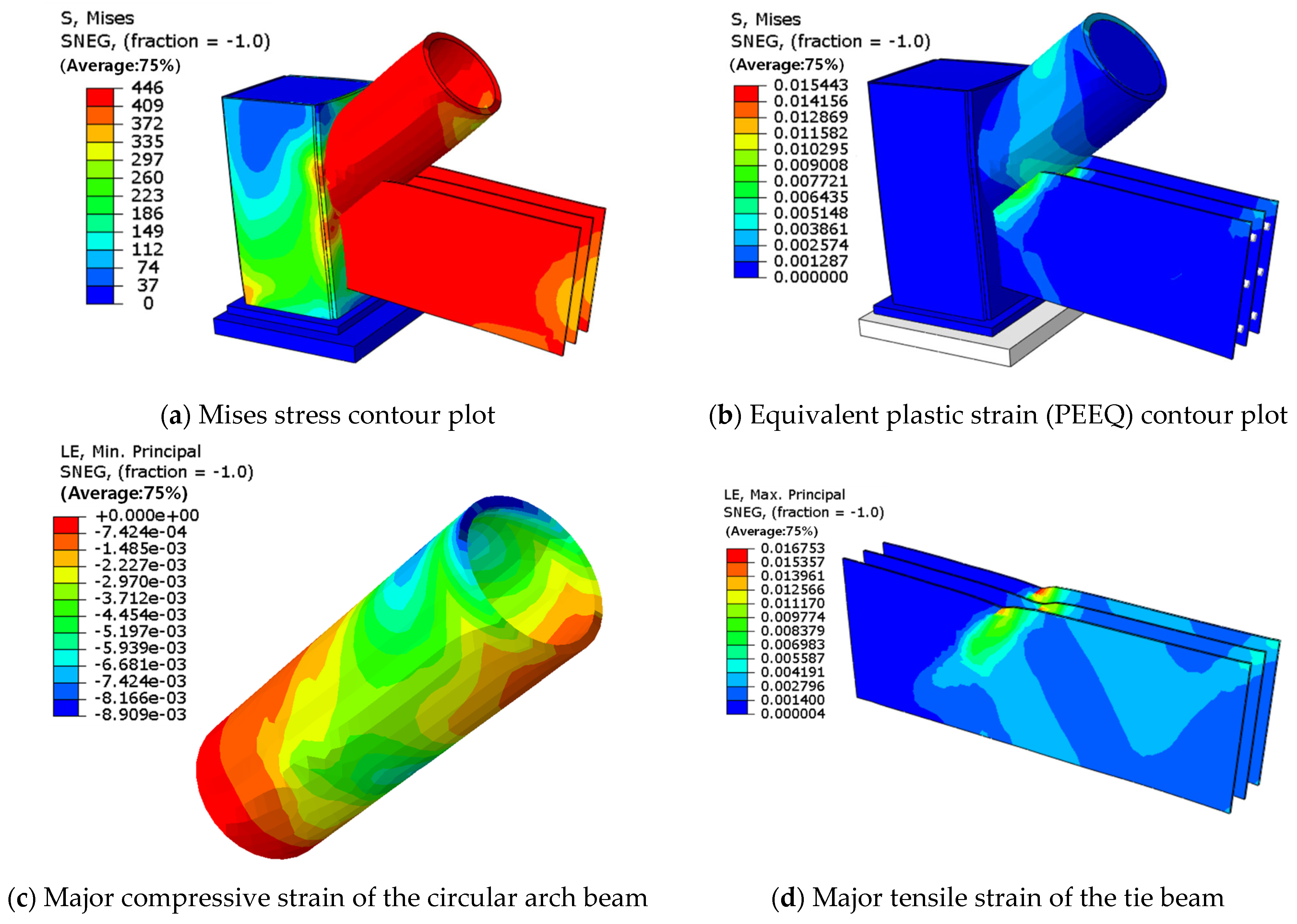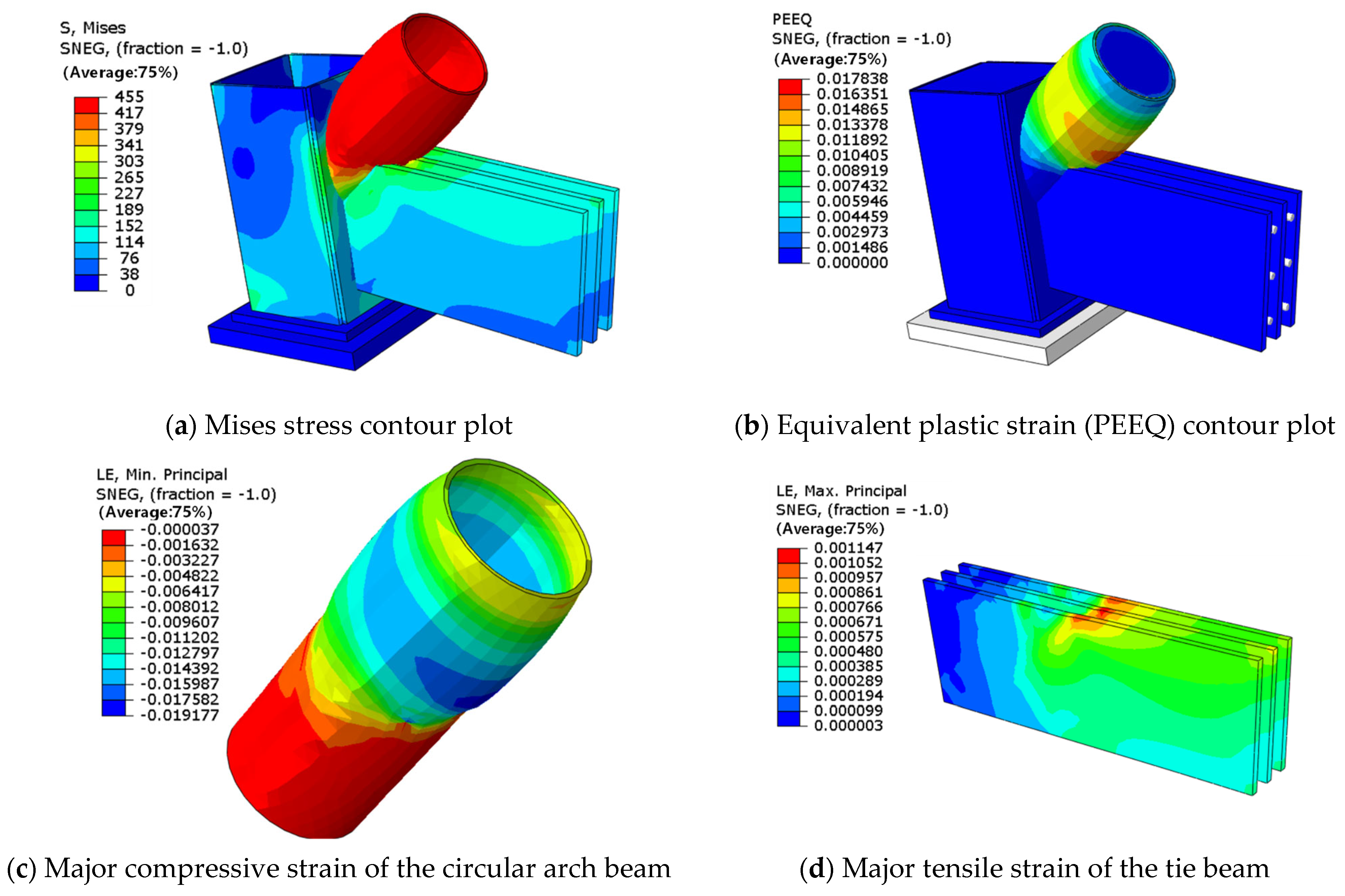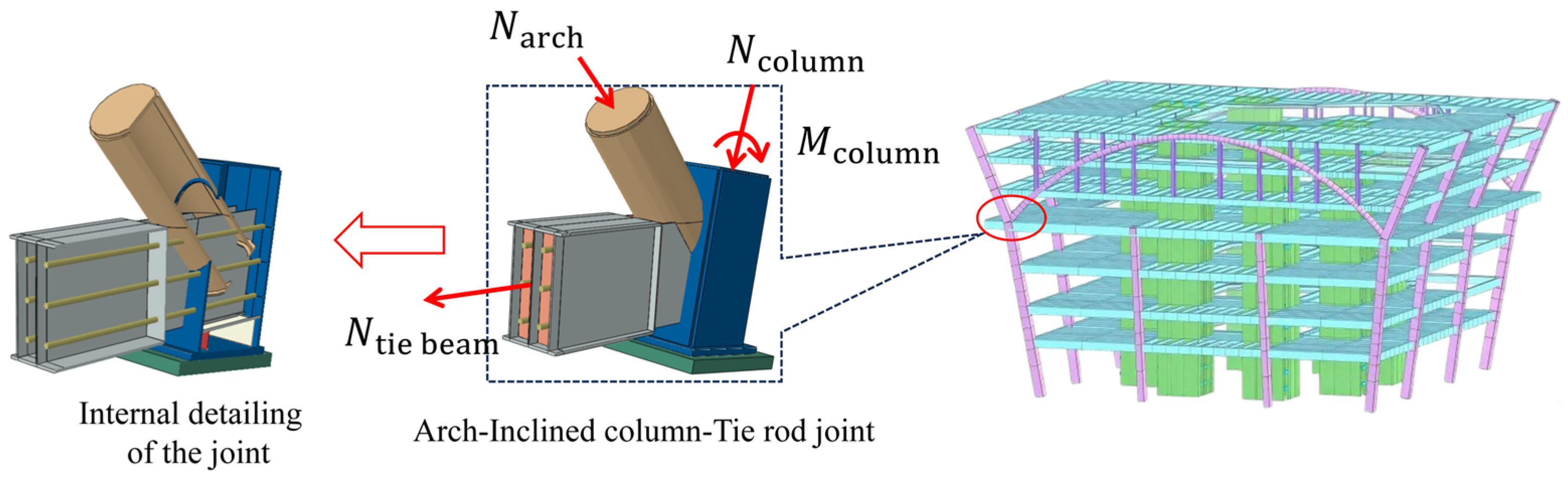 - A novel configuration for a concrete-filled steel tube arch-column-tie beam joint is proposed. The joint exhibits a rational design and reliable mechanical performance. Through finite element simulation, it can be observed that the joint remains elastic under the design load for both conditions, including the presence of prestressed high-strength rods and the failure of the rods, meeting the design requirements. The joint reaches its ultimate capacity when extensive yielding occurs in the tie beam along the junction region with the circular arch beam, as well as in the steel tube of the arch beam. At this stage, the steel plates and concrete within the joint zone remain elastic, ensuring reliable load transfer.