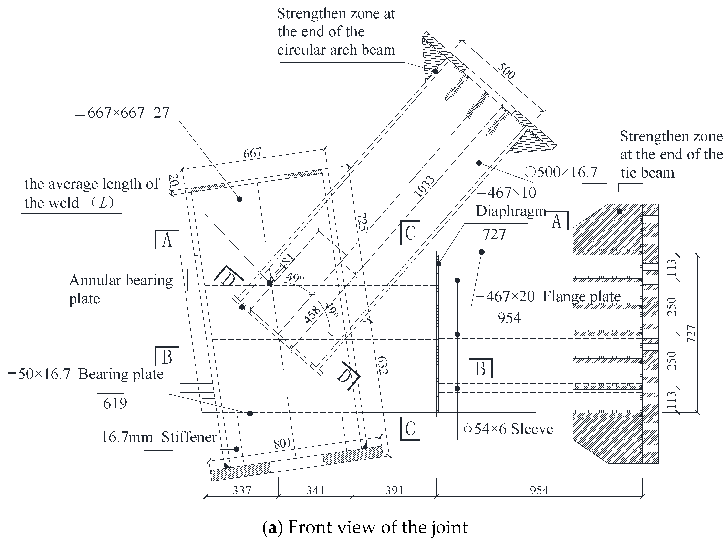 - Connection design at the arch beam-tie beam intersection: The circular CFST arch beam is inserted into the joint zone. Slots are cut into the circular steel tube to allow the three web plates of the tie beam to pass through. The web plates are connected to the steel tube using groove full-penetration welds, forming an engagement segment with an average length of L. This design transfers part of the axial force from the arch to the tie beam’s web plates via shear through the welds.