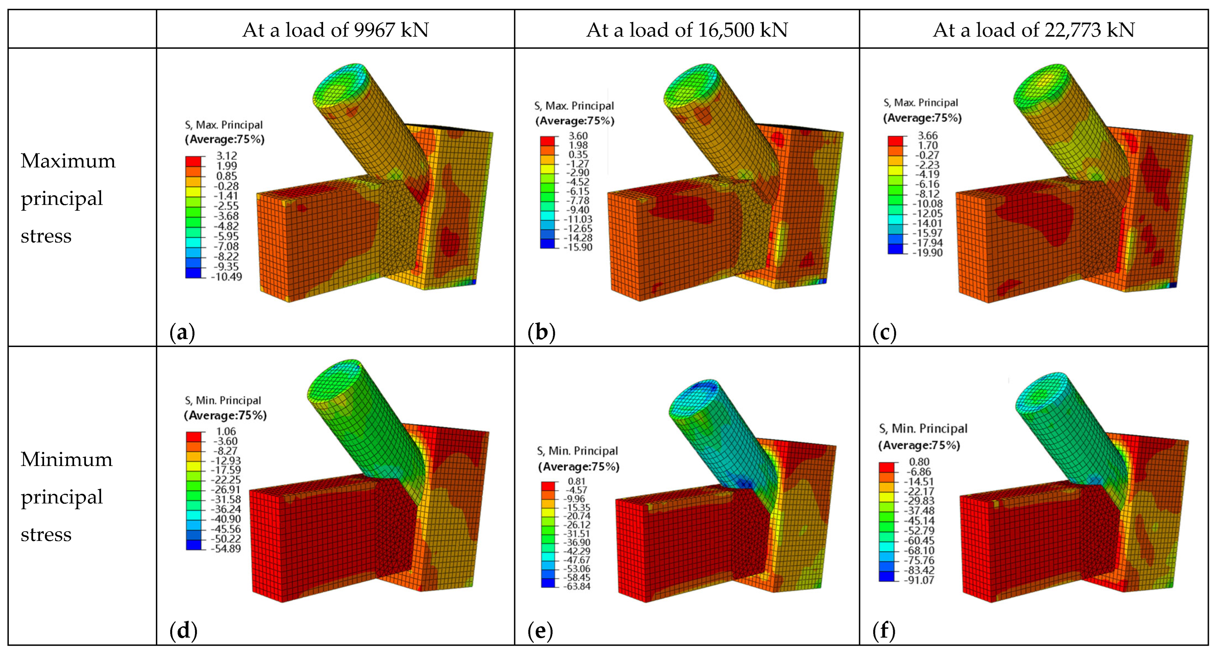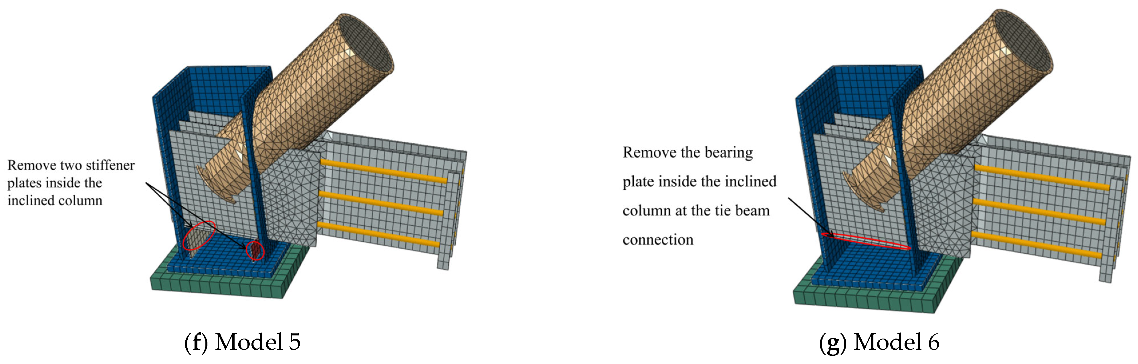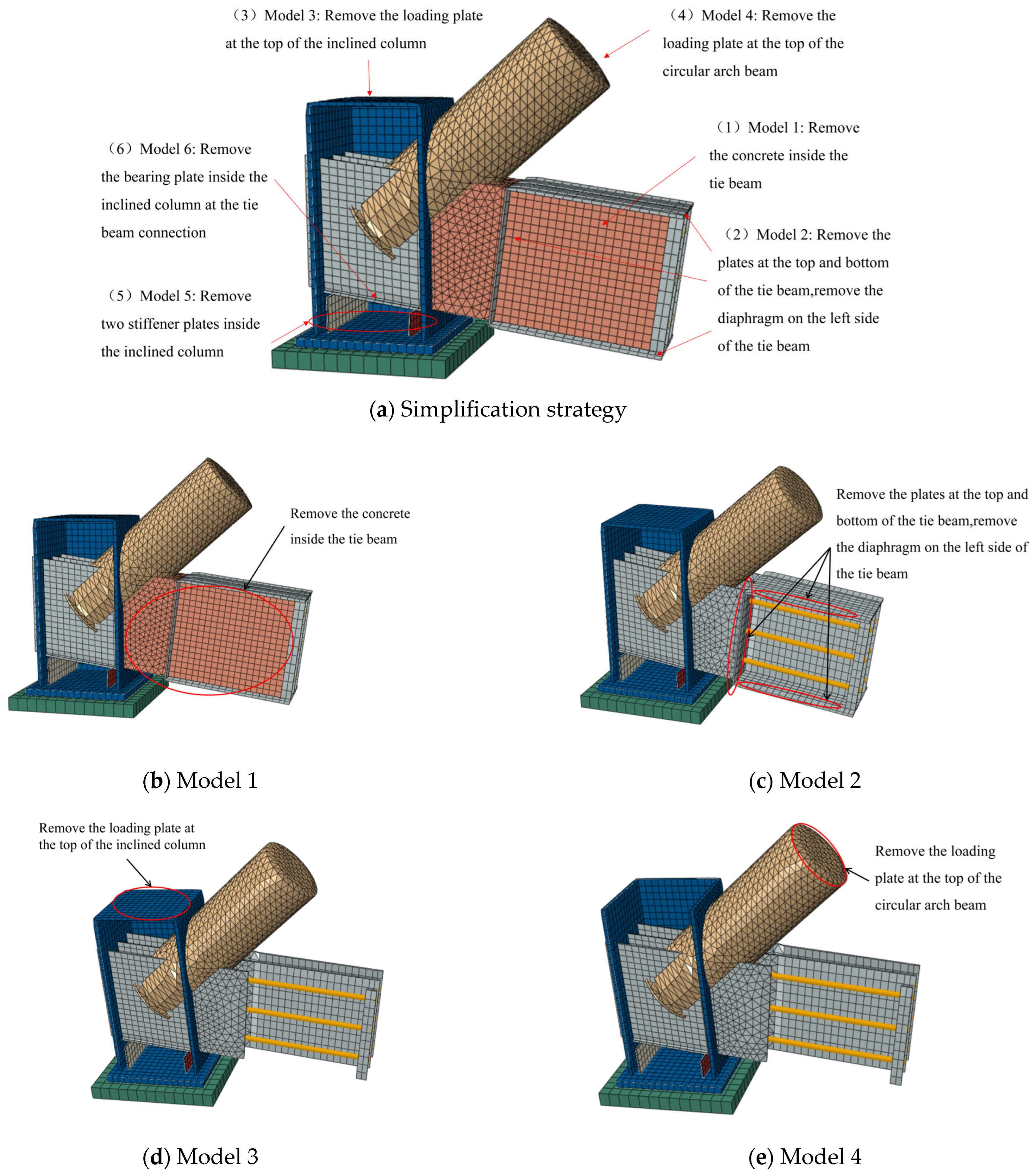 - As mentioned above, under the most critical design condition, the horizontal shear force in the column is only 0.29 times of the force in the tie beam. Therefore, the horizontal resistance of the inclined column was neglected, with only the balance between the horizontal components of the tie beam and the circular arch beam considered in the analysis. This approach results in a more critical load condition for the tie beam and represents a conservative simplification, and it is also adopted in the design method. In the numerical model, the bottom of the inclined column was provided with a sliding support.