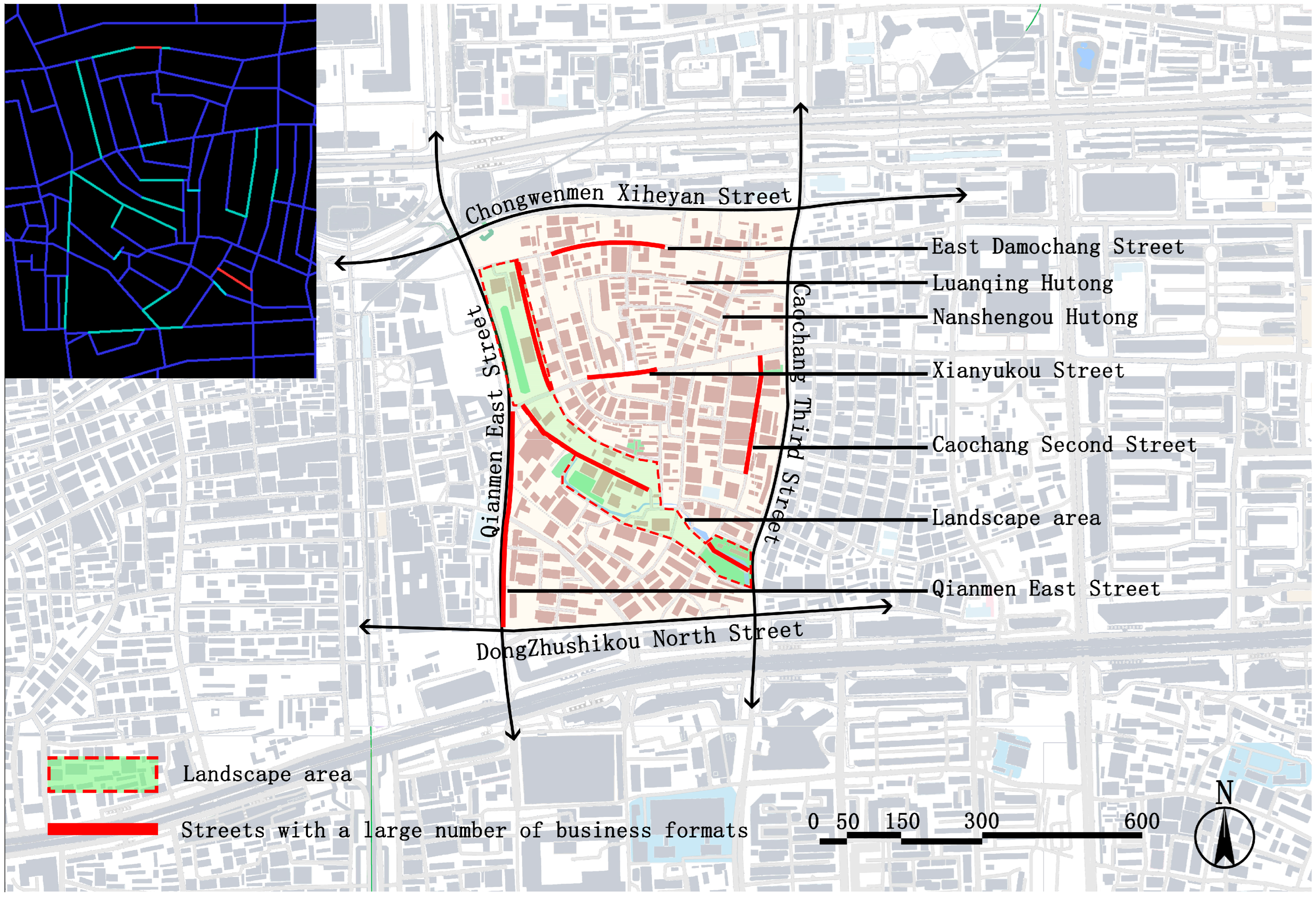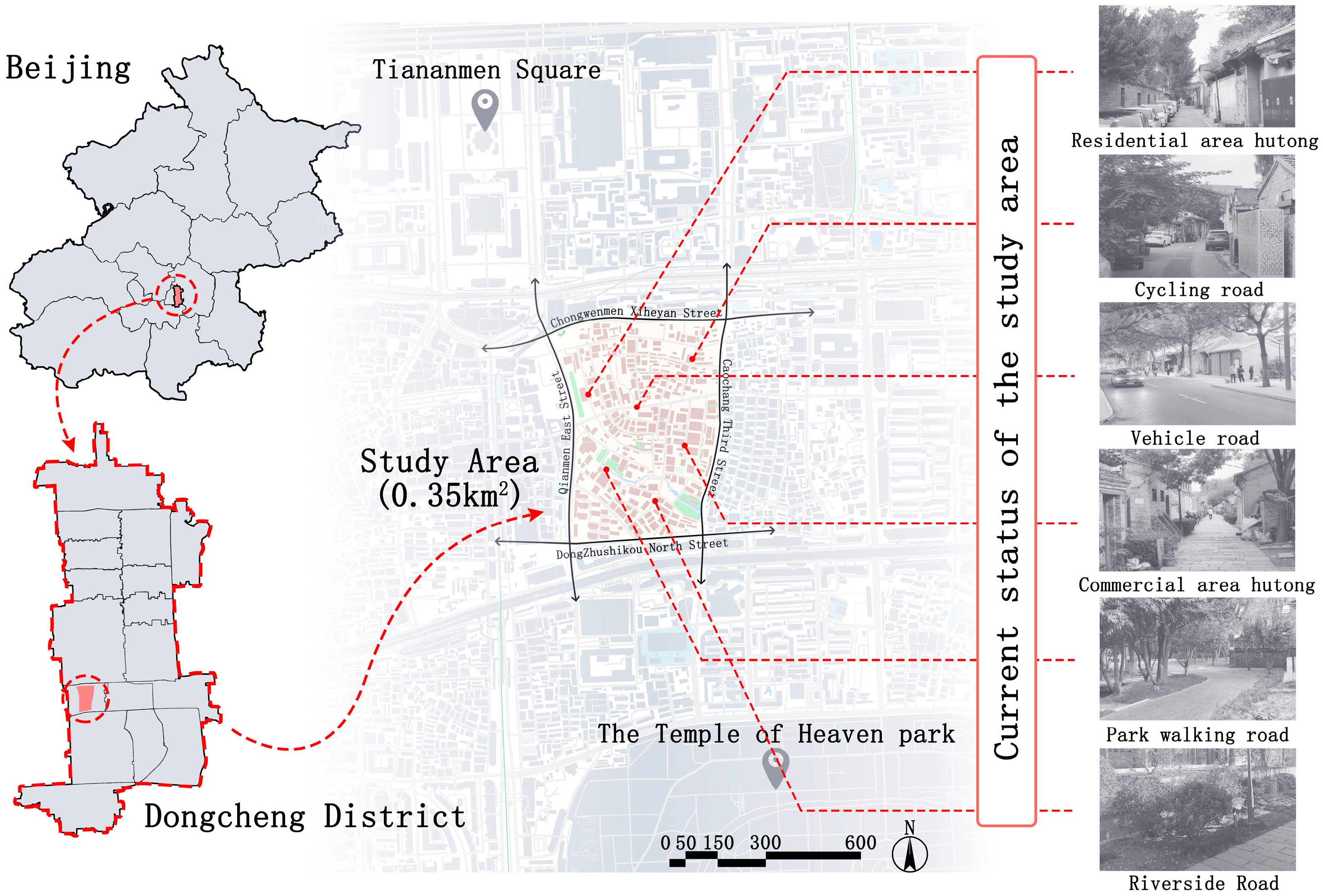 2, the Qianmen area integrates commercial, residential, and cultural functions and functions as both a major tourist destination and a key focus of urban renewal in Beijing. As illustrated in