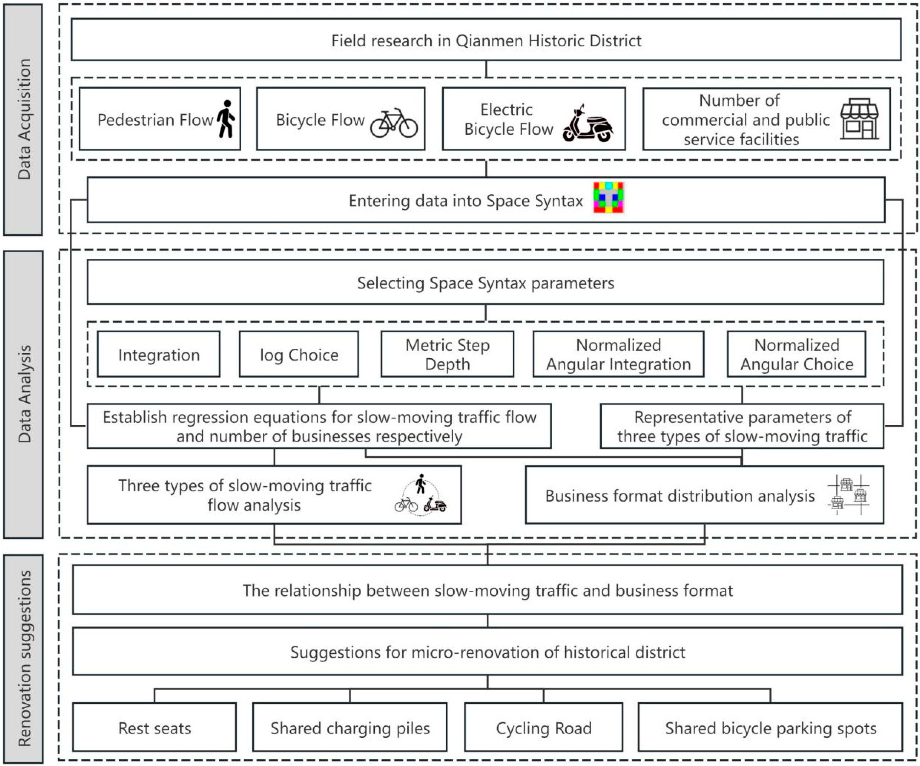 In this study, space syntax theory was employed to analyze the slow-moving traffic system in the Qianmen area, and the analytical results were subsequently used to inform and optimize regional renovation design strategies. The overall research framework follows the logical sequence of “form–behavior–function,” whereby space syntax is applied to construct and interpret the spatial structure of the case study area. By collecting and analyzing slow-traffic flow data, the study captures spatial behavior, that is, whether the designed spatial configuration can be effectively translated into actual movement patterns. Ultimately, the distribution of commercial spaces is used to evaluate whether observed behaviors generate economic vitality, thereby serving as a robustness test for the bidirectional relationship between traffic flow and business formats.