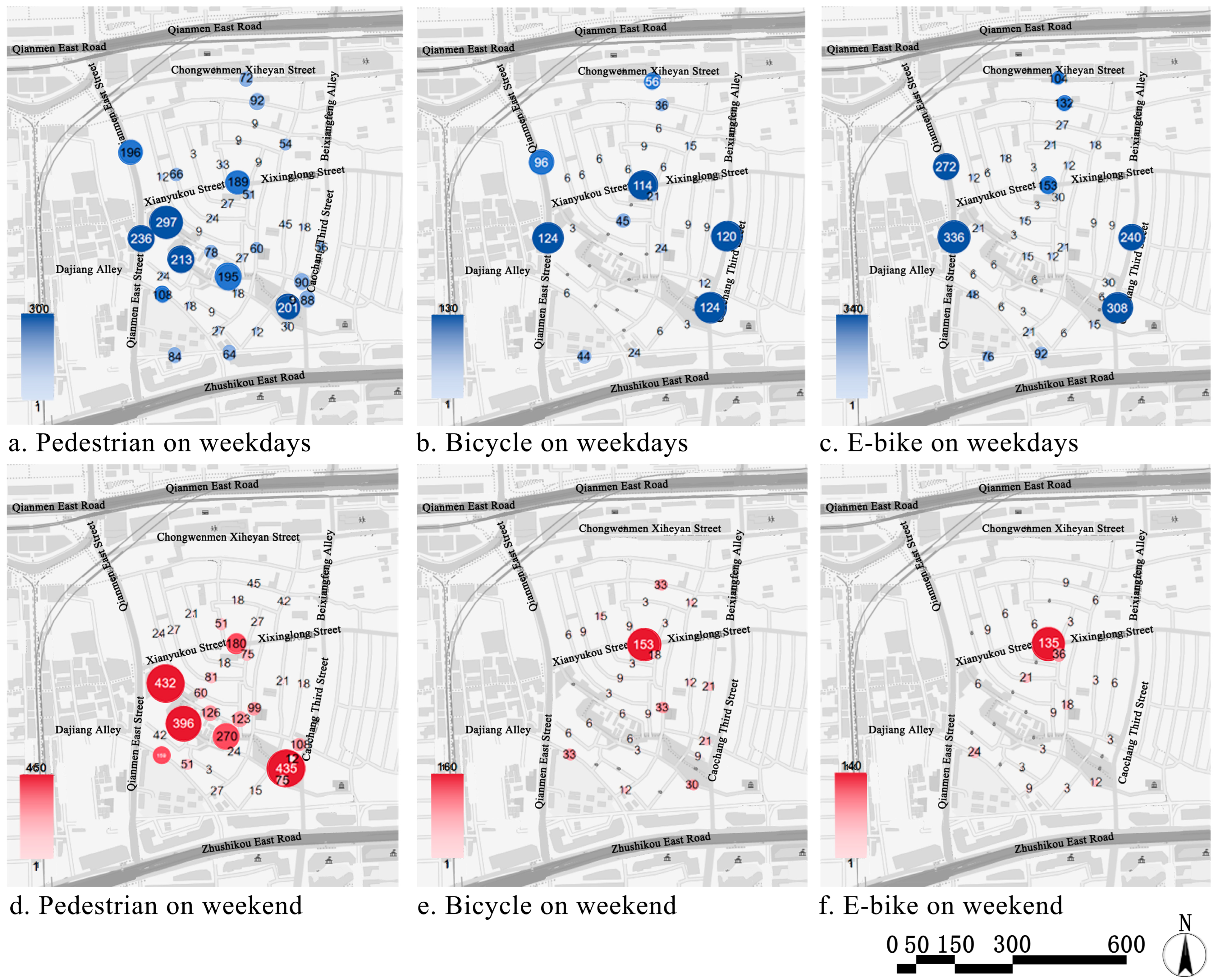 For the collection of slow-moving traffic data, on-site measurements were carried out for three modes of movement within the Qianmen area: pedestrian, bicycle, and e-bike traffic. Monitoring points were evenly distributed across the study area to ensure representative spatial coverage. To avoid ambiguity in assigning traffic flows to specific street segments, particularly at intersections where flow attribution is uncertain, all measurement points were placed along mid-block street segments and away from dead-end roads. This approach ensured that the collected data accurately reflected the overall movement potential of the area while minimizing localized bias.
