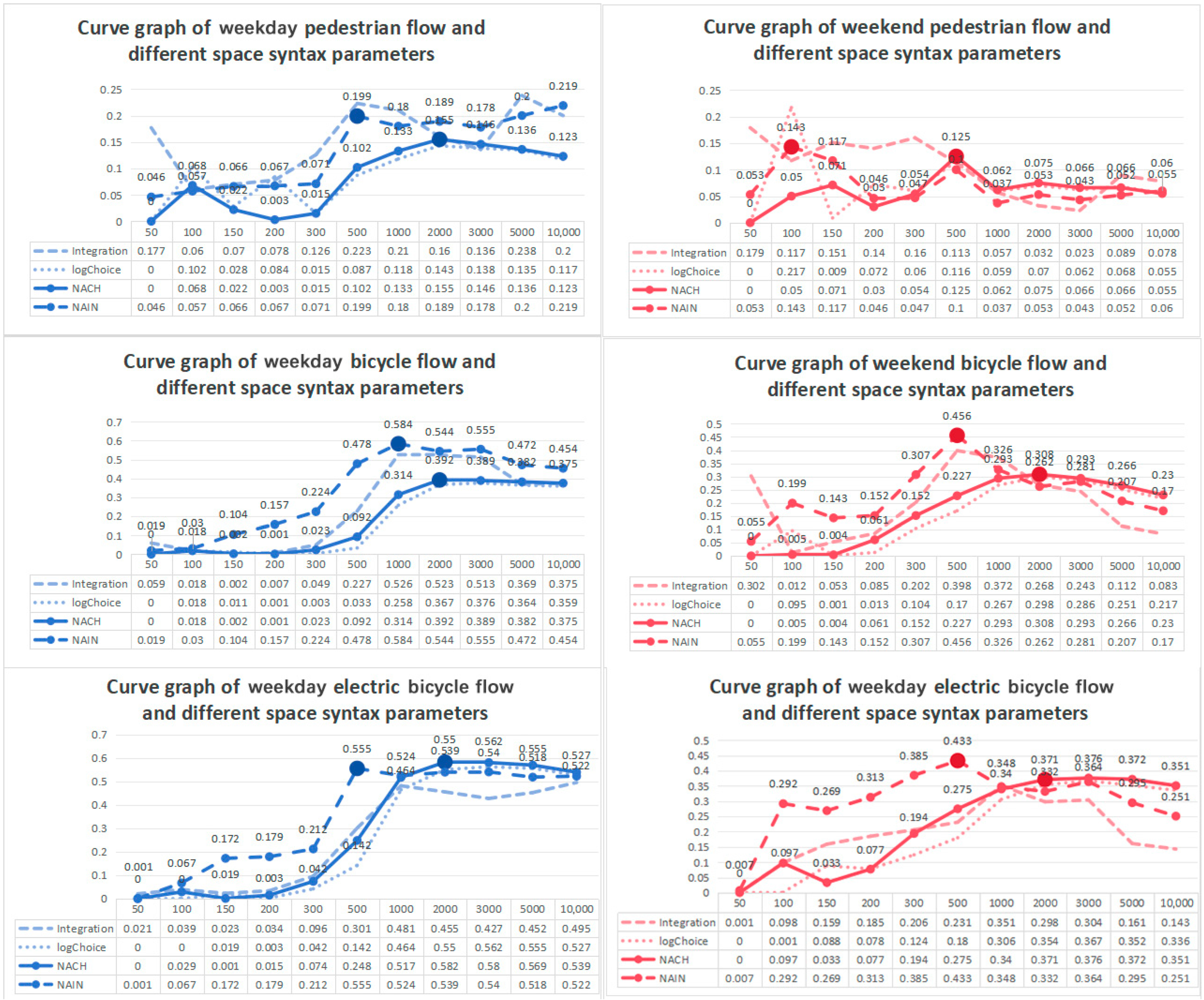 To determine the optimal space syntax parameters for three types of traffic during weekdays and weekends and further investigate the impact of space structure on slow-moving traffic, data for three traffic categories (pedestrian, bicycle, and e-bike) during weekdays and weekends were input into the line segment model of space syntax. After standardizing the traffic data, space parameters at different radii were calculated and the R2 values of data related to the three categories of traffic flow during weekday and weekend were determined. The space parameters exhibiting the highest fitting degree with the three slow-moving traffic categories of traffic flow were identified as representative space parameters for analyzing the topological patterns of business format distribution under these three slow-moving traffic conditions.
