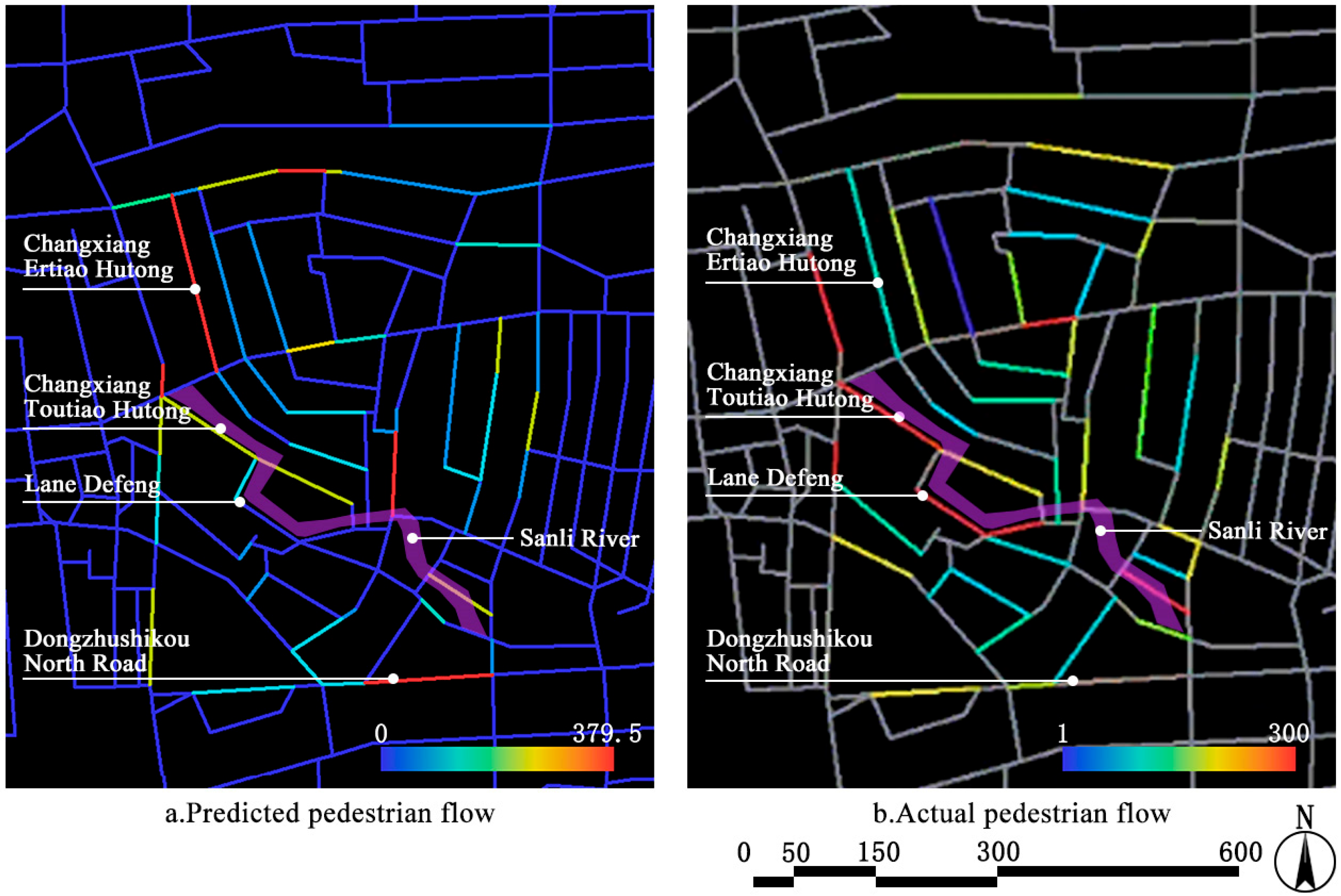 Section 2.2 alongside three types of actual slow-moving traffic flow data. Then, identify which space parameters and business format influenced each of the three types of slow-moving traffic. Subsequently, slow-moving traffic flow on streets within the Qianmen area was forecasted to identify big-traffic-flow and small-traffic-flow zones, providing reference for targeted micro-renewal of streets within the district.