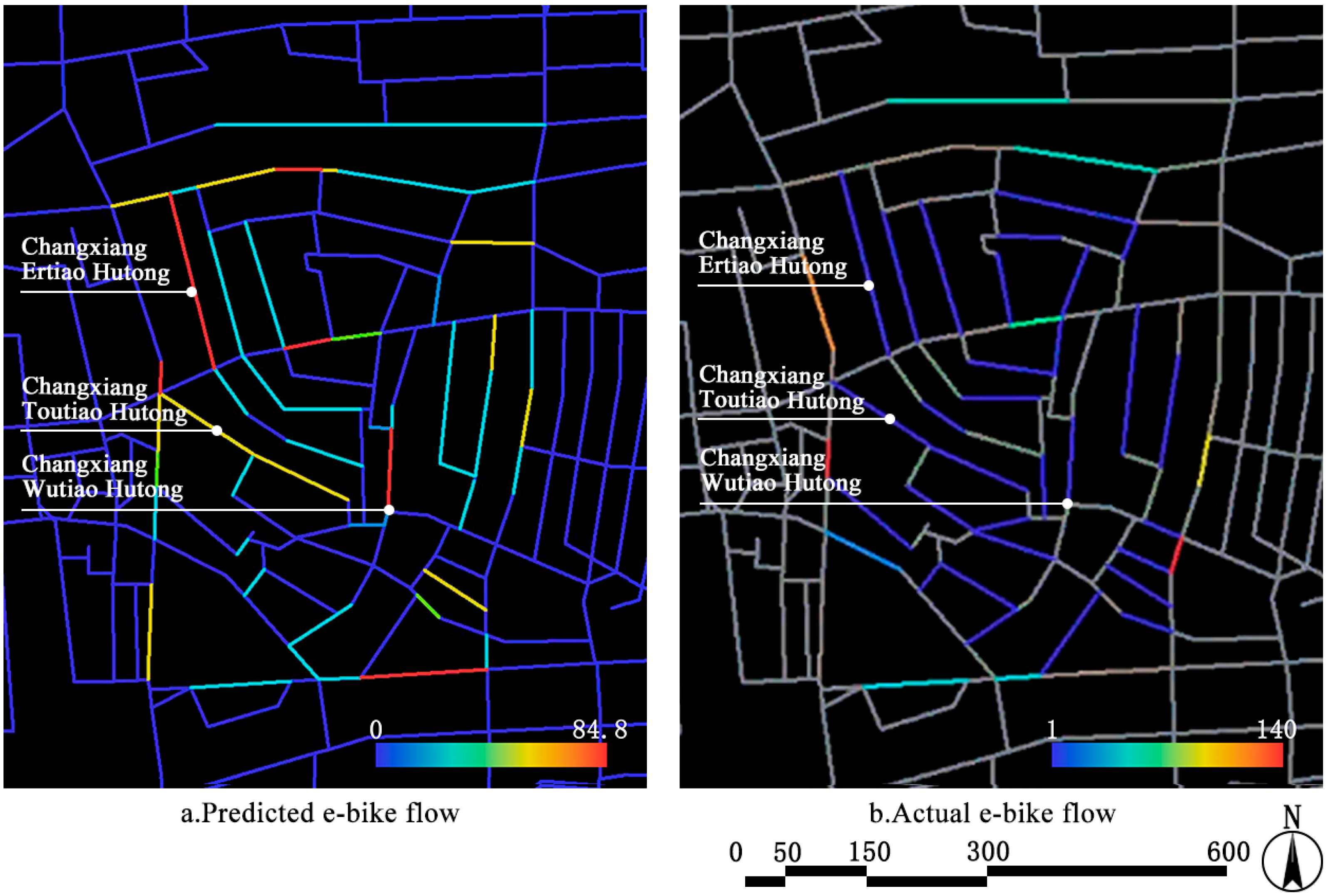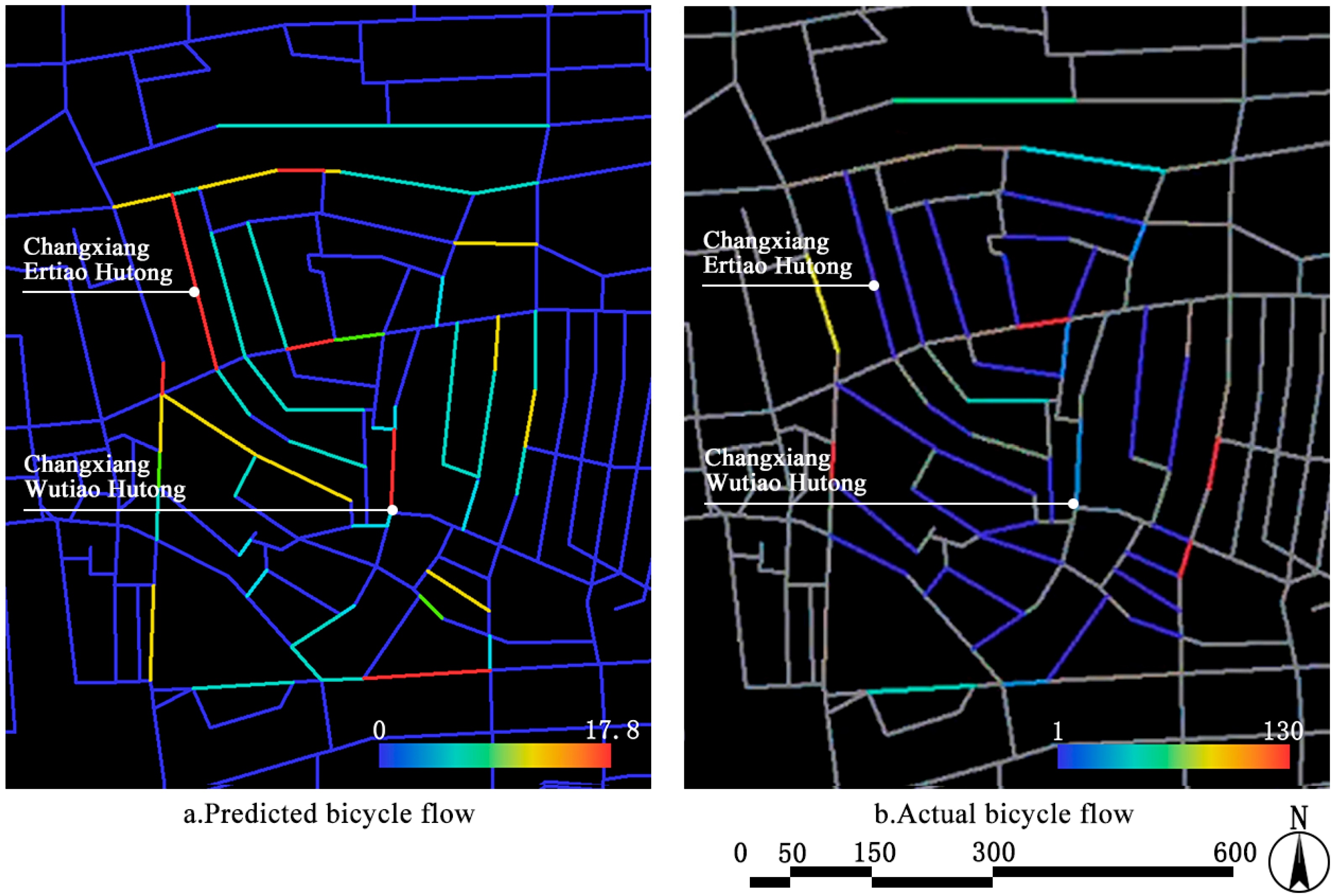 This study analyzed the distribution patterns of business formats and road traffic flow in the Qianmen historic district using space syntax analysis, predicting both the total number of business formats and three types of slow-moving traffic flow.