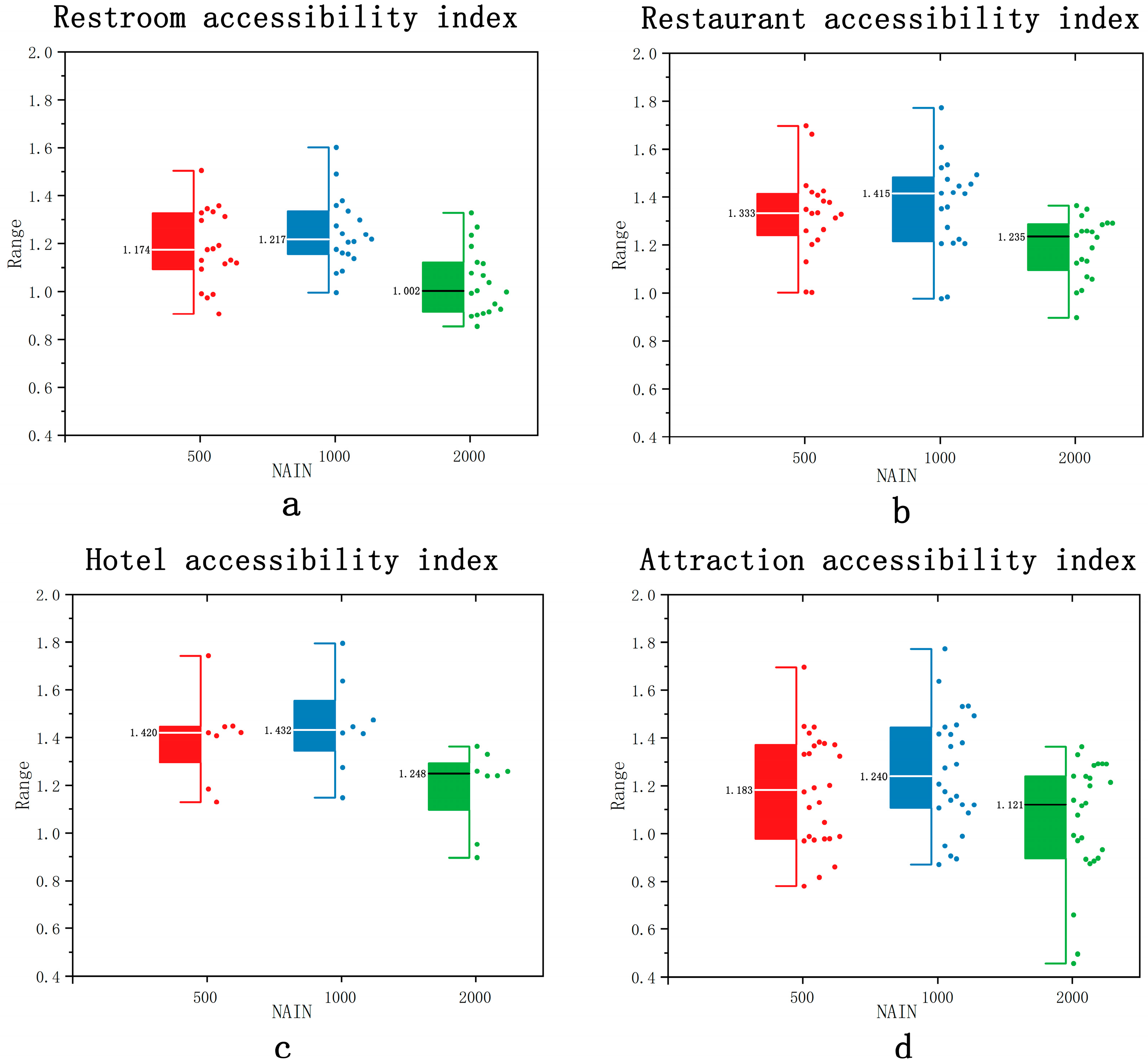 Figure 8. Within the highly integrated branch road network at 500 m and 1000 m radii, differences in walking and cycling accessibility among business formats were minimal, with standard deviations below 0.08. This indicates little variation in shortest-path slow-travel flows within the study area. A closer examination of functional demand reveals that hotels and restaurants require frequent access for guests and delivery personnel, necessitating higher accessibility to the shortest routes within the hutongs. In contrast, public restrooms and attractions are primarily destination-oriented, resulting in relatively lower accessibility requirements. At the arterial road level (main streets or primary roads within the hutong network) at a 2000 m radius, short-distance accessibility rankings follow the pattern Hotel ≈ Restaurant > Restroom > Attraction, demonstrating that functional characteristics largely determine the selectivity of slow-moving traffic tiers. These findings provide a quantitative basis for differentiated renewal strategies, including the development of a “hutong slow-moving traffic loop” and the enhancement of main street functions. As a densely structured historic district, the Qianmen area faces challenges in aligning business formats with slow-moving traffic, a key factor for enhancing district vitality. By quantifying accessibility differences through space syntax parameters, hotels and restaurants with high-frequency traffic can improve connectivity with the hutongs and increase e-bike charging stations to stimulate customer flow. For destination-oriented facilities such as restrooms and attractions, wayfinding and guidance systems can compensate for lower accessibility, preserving the historical texture of the hutongs while improving the efficiency of space utilization.
