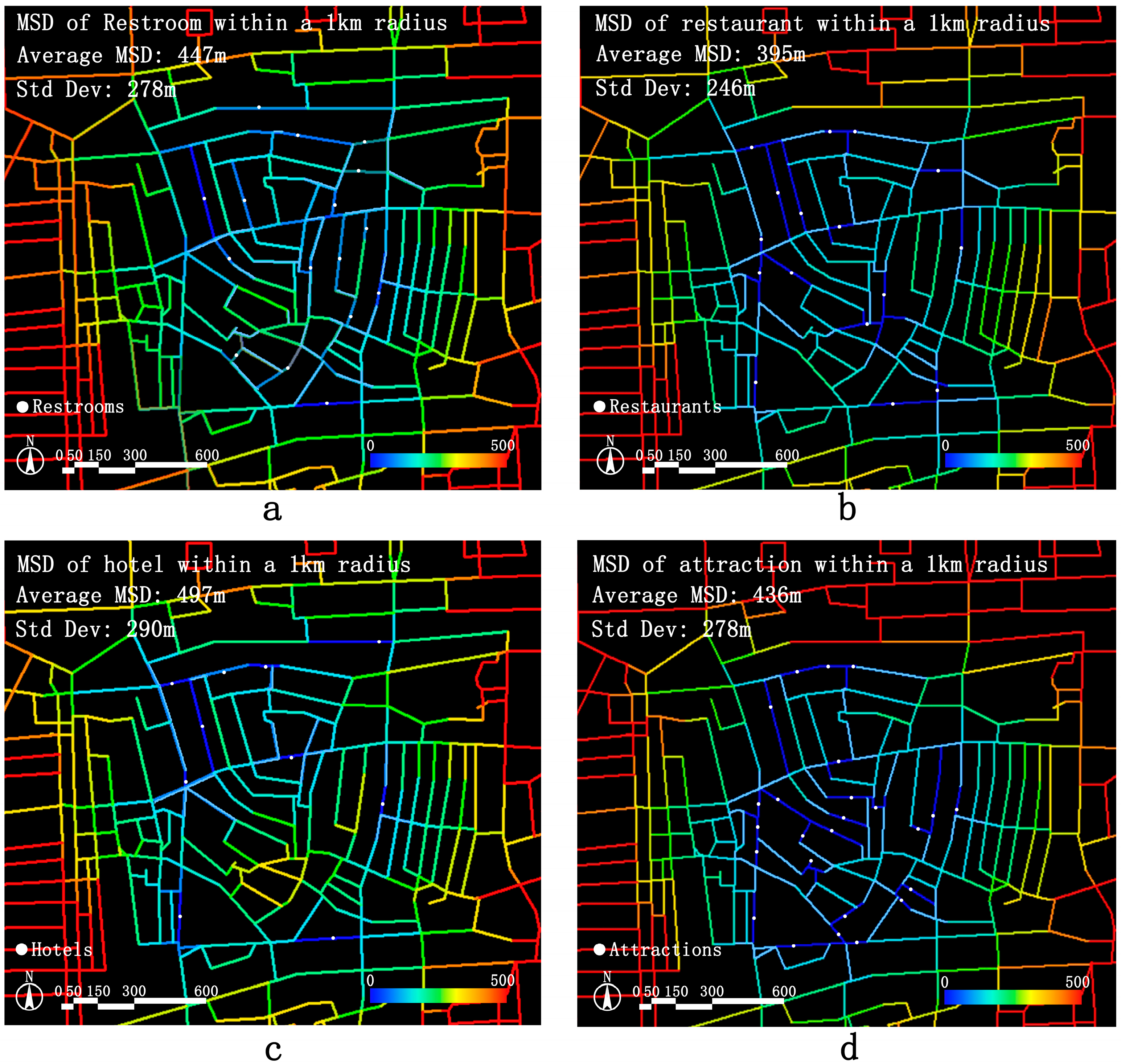 Figure 9 shows that the service radii for restrooms, restaurants, hotels, and attractions are 447 m, 395 m, 297 m, and 436 m, respectively, with corresponding coefficients of variation of 0.62, 0.62, 0.58, and 0.64. In terms of distribution uniformity, the ranking is Hotel > Restroom = Restaurant > Attraction. Hotels exhibit the most uniform distribution, with minimal variation in distances within their service radii, allowing customers to conveniently access hotel services across a broader area. In contrast, the distribution of restrooms, restaurants, and attractions is less uniform. However, all four business formats have coefficients of variation around 0.6, indicating the presence of localized service gaps throughout the area. These findings reflect the characteristics of Qianmen’s street layout, narrow, winding, and complex, which complicates the even coverage of service facilities. Nevertheless, the distribution patterns of business formats within their service radii are discernible, providing a quantitative basis for informing subsequent regional renovation strategies. The analysis also highlights a common issue in historic districts: service facility layouts often follow historical patterns, resulting in uneven functional coverage relative to contemporary needs. Specifically, restrooms and attractions exhibit relatively long service radii because they are typically tucked deep within winding hutongs, making them easily accessible only to local residents, while tourists may struggle to locate them quickly. Conversely, tourist-oriented facilities such as hotels and restaurants have shorter service radii and cannot fully accommodate visitor flows. Targeted micro-renewal interventions, such as adding signage and supplementing service nodes, can reduce service gaps without altering the original hutong layout, thereby preserving the historical appearance of the district while enhancing functional accessibility.