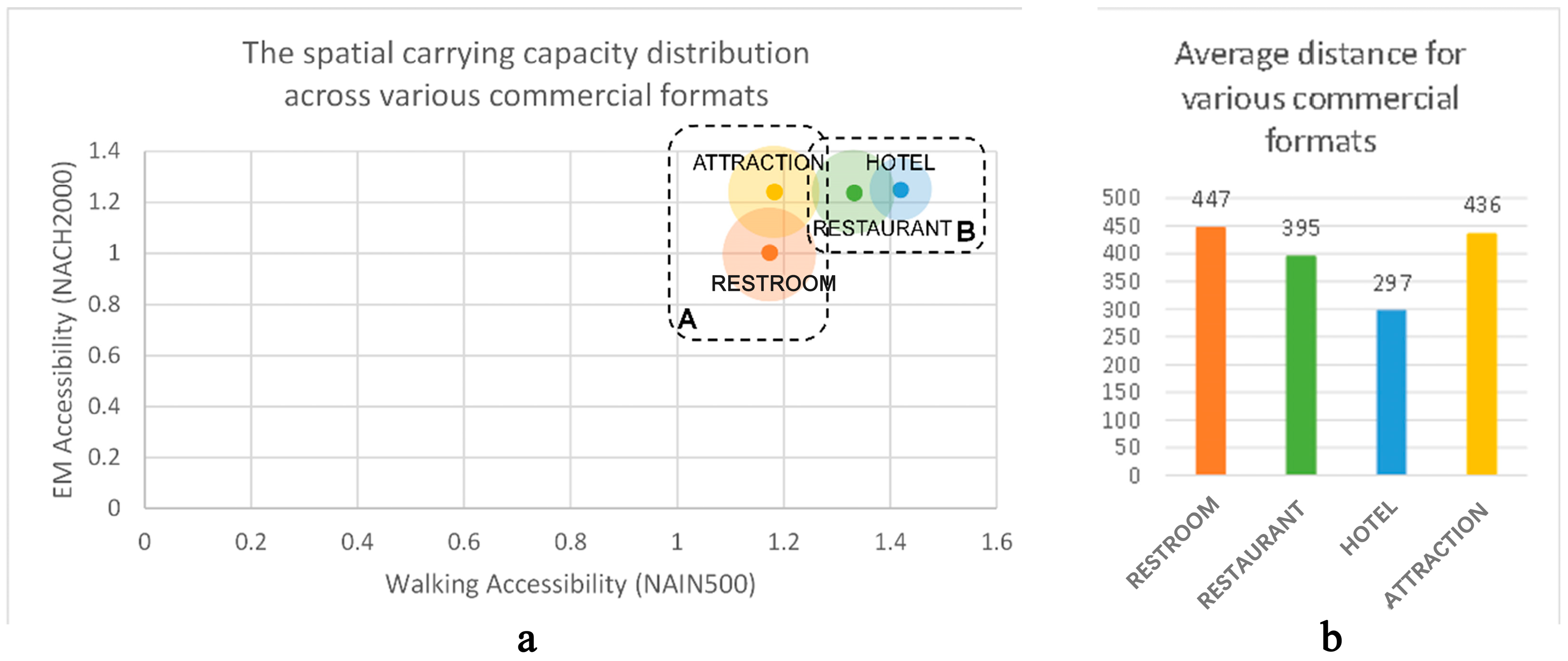 Business formats in Category A, including restrooms and attractions, exhibit dispersed spatial distribution, serve broad coverage areas, feature high MSD values, and possess low topological connectivity. Public restrooms typically serve a wide area and are often located in remote alleys, resulting in longer travel distances, while attractions experience uneven visitor distribution due to factors such as location, scale, and appeal. Although both types require a certain level of walking or cycling accessibility, their overall accessibility demands are lower compared to hotels and restaurants.