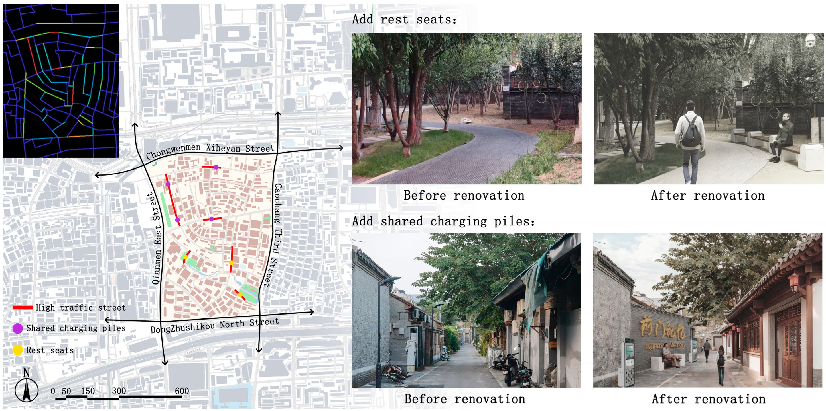 Section 4.4. On densely trafficked streets, such as Changxiang Ertiao Hutong, Changxiang Wutiao Hutong, and the route bordering Sanlihe Park, the placement of amenities like rest seats and shared charging piles can enhance space utilization and encourage pedestrian lingering. Using space syntax analysis, pedestrian flow patterns can be predicted to strategically position these amenities. By incorporating traditional Beijing elements into the Qianmen area and adding rest facilities along high-traffic streets, pedestrians are more likely to pause, satisfying their rest needs while simultaneously increasing foot traffic to nearby commercial establishments.