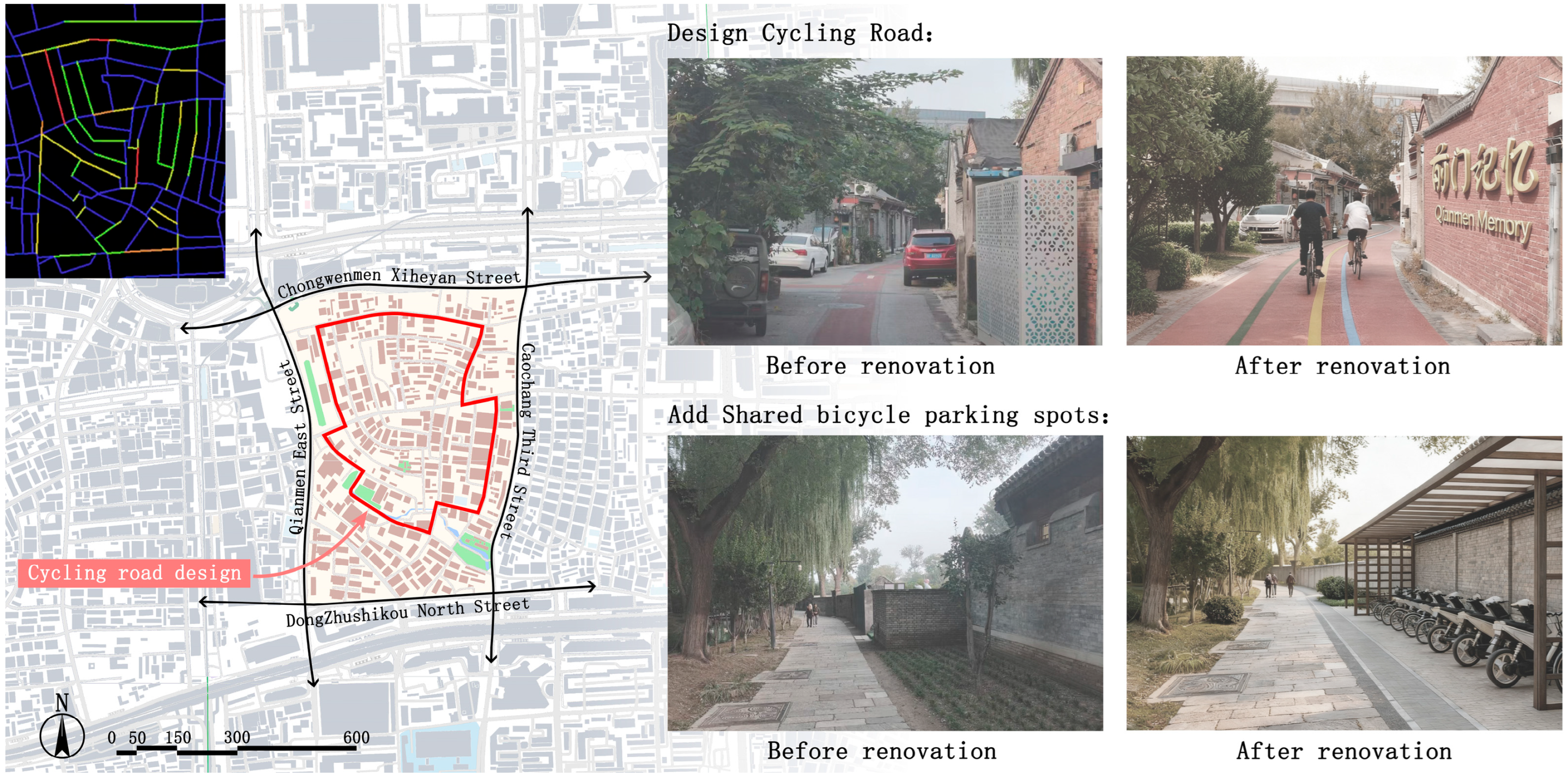 For streets with high bicycle and e-bike traffic, dedicated cycling routes marked with colored pavement and equipped with rest areas can be established. Based on the predicted bicycle and e-bike traffic flows, high-traffic streets, such as Changxiang Ertiao Hutong and Changxiang Wutiao Hutong, can be linked to lower-traffic streets, such as Nanshenggou Hutong and Caochang Ertiao Hutong, to form a cycling loop. Signage can guide cyclists to voluntarily choose streets with lower traffic, which not only alleviates congestion on busy streets but also directs potential customers to shops, cafes, and cultural stores along less-traveled streets, thereby revitalizing commercial activity across the district. In addition, bicycle parking spots can be installed along both sides of the streets to prevent disorderly parking and reduce street congestion. An illustrative example of the proposed street renovation is shown in