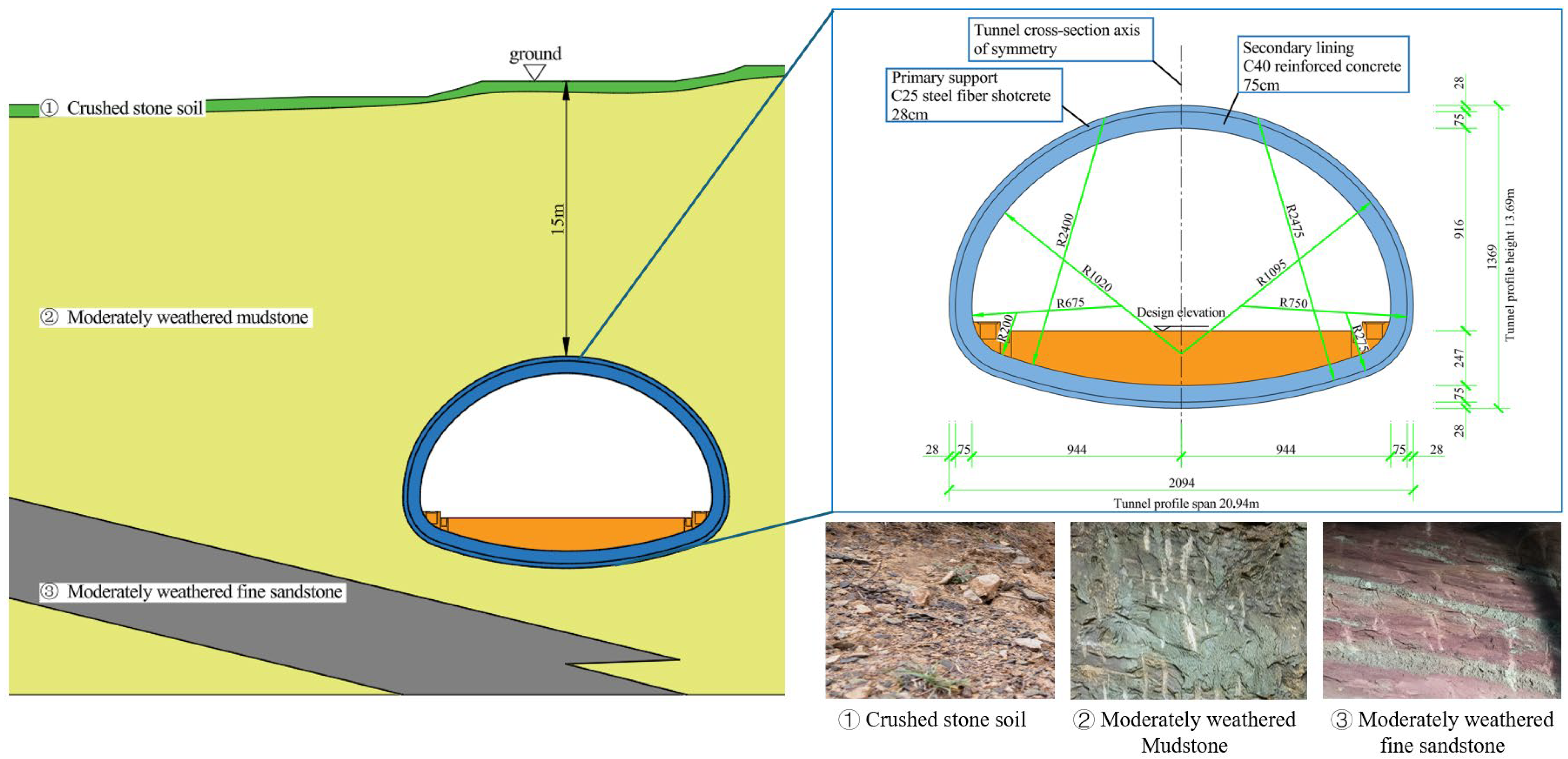 | secondary lining | reinforced concrete | Strength Grade C40, Thickness 75 cm |