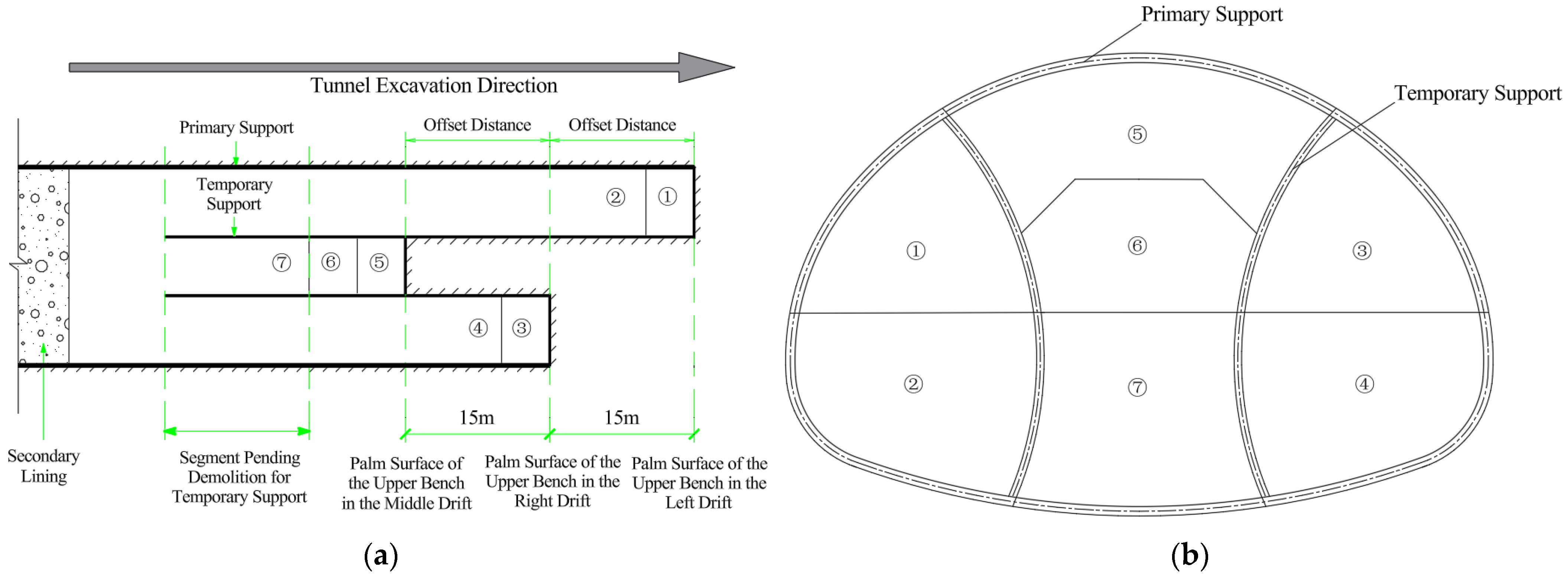 | 1 | Excavate Part ①, and construct the primary support and temporary support for the upper bench of the left drift |