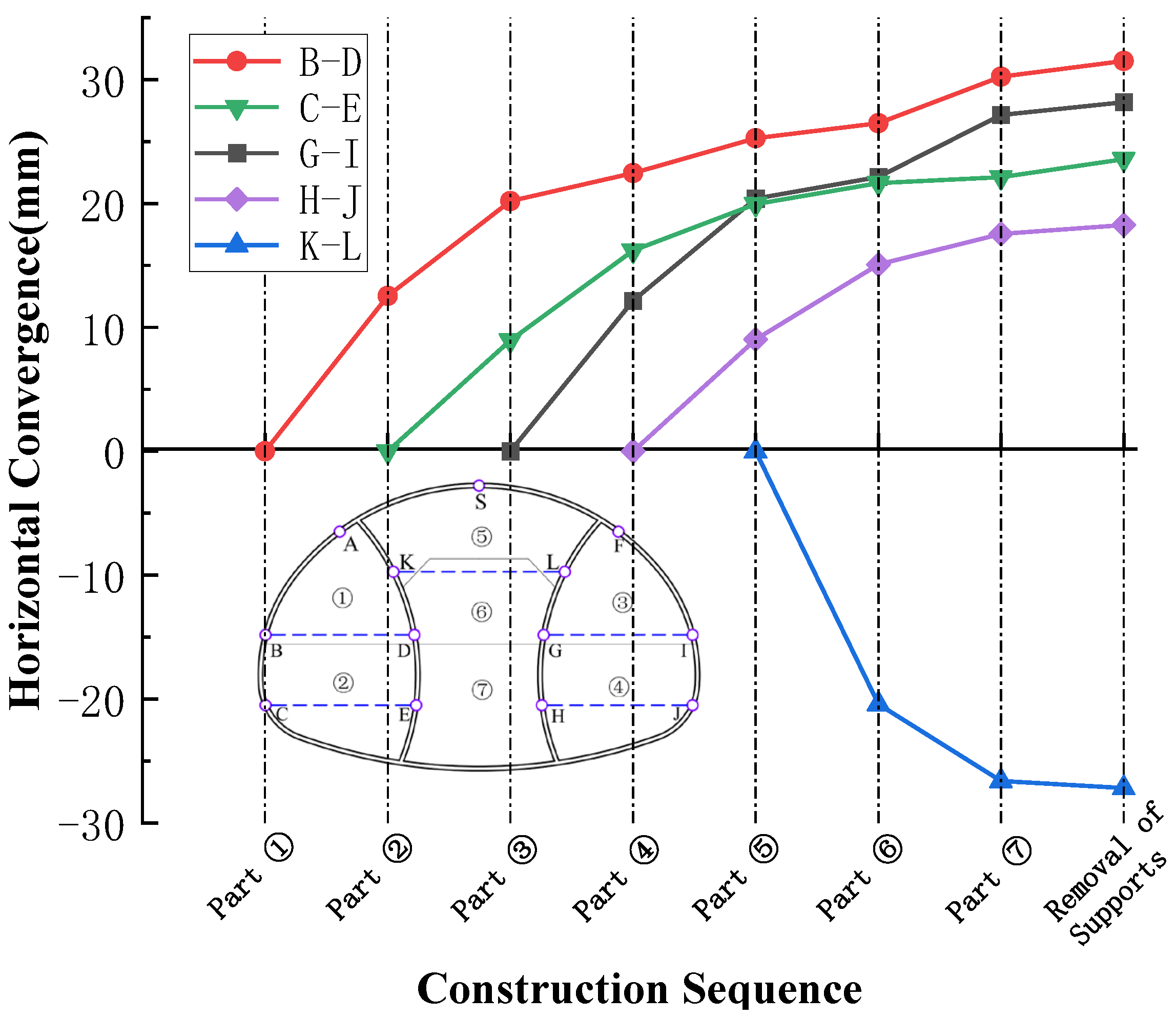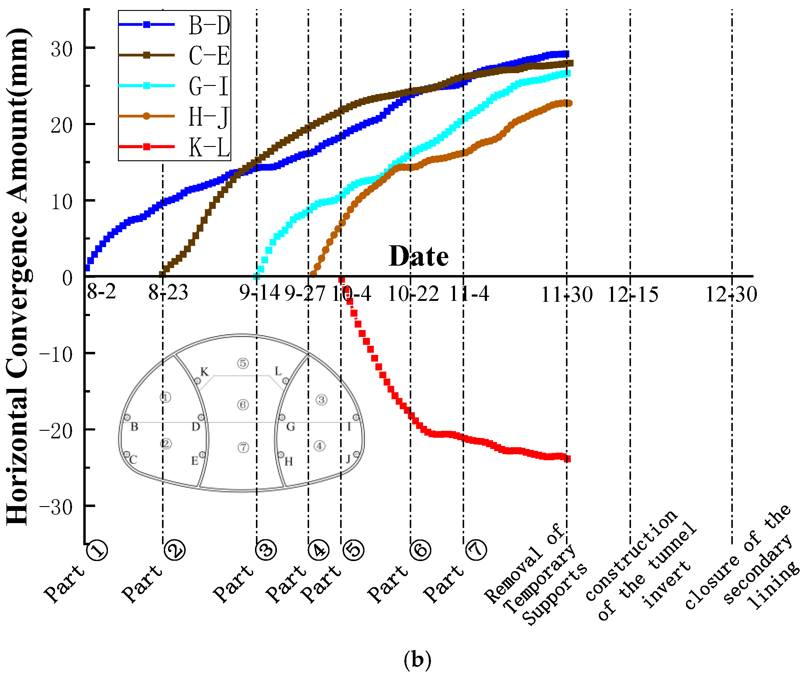 5.2. Data Analysis of Primary Support Deformation Monitoring