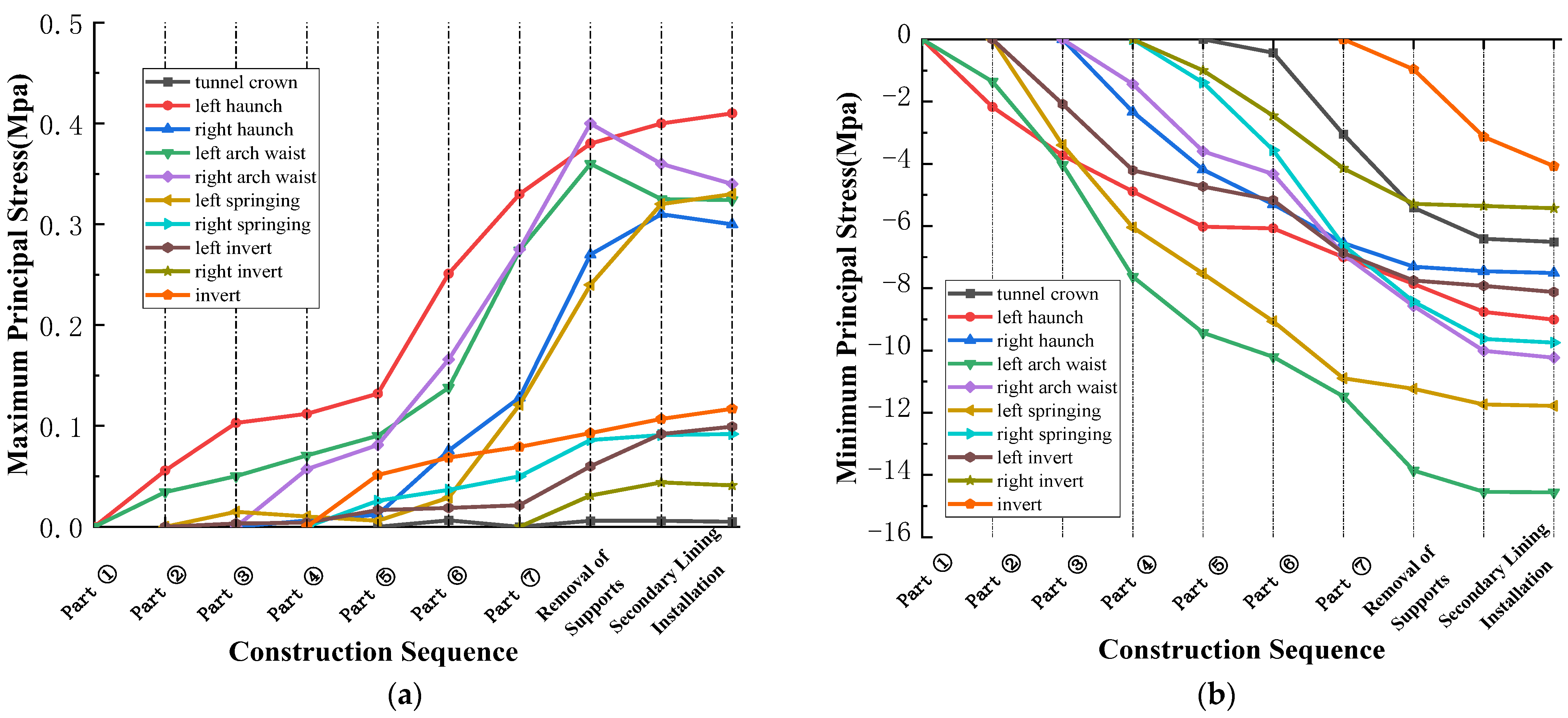- Stress evolution of the primary support and development of the plastic zone in the surrounding rock: Primary support stresses increase sharply after excavation of each segment and then tend to stabilize. The maximum tensile stress occurs at the left haunch (0.41 MPa), and the maximum compressive stress at the left arch waist (14.56 MPa). After overall excavation, the left side experiences significantly higher stress, resulting in an eccentric stress state. The surrounding rock plastic zones exhibit a butterfly-shaped distribution, concentrated mainly at the haunches and arch springings.