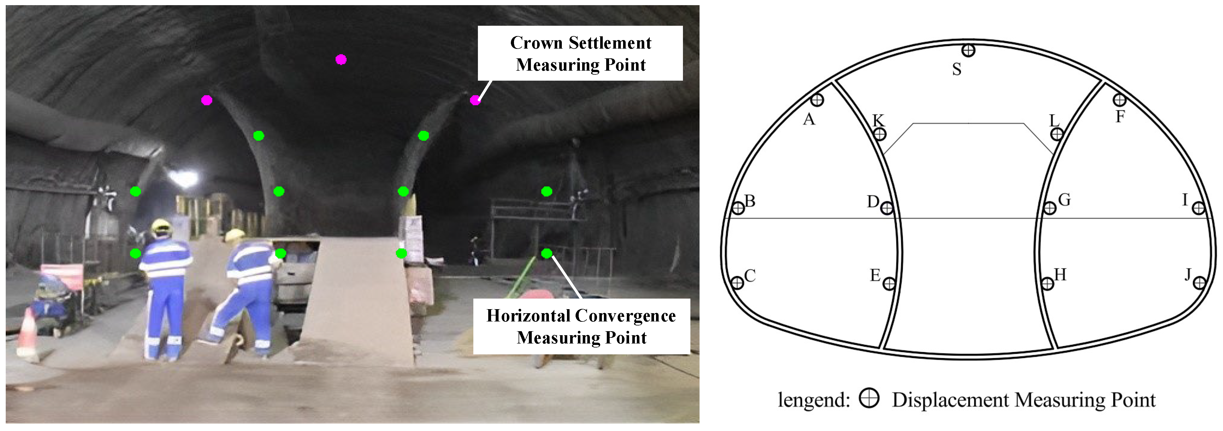 - Zhou, Z.; Zhao, J.; Tan, Z.; Zhou, X. Mechanical Responses in the Construction Process of Super-Large Cross-Section Tunnel: A Case Study of Gongbei Tunnel. Tunn. Undergr. Space Technol. 2021, 115, 104044. [Google Scholar] [CrossRef]