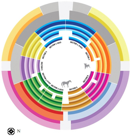 Its arena has a diameter of 36.7 m, a total diameter of the building of 64.5 m, and an estimated volume of 61,693 m3. The bullring is organised into seven sectors (tendidos): the North half (sectors: 1 even, 7, 6, and 5) and the South half (sectors: 1 odd, 2, 3, 4 odd, and 4 even) (see Figure 4).