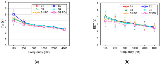 Campo Pequeno bullring: (a) spatial average of reverberation time as a function of frequency for each source position (S1–S4 with the oculus closed and S1 PO and S2 PO with the oculus partially open), (b) spatial average of the Early Decay Time as a function of frequency for each source position (S1–S4 with the oculus closed and S1 PO and S2 PO with the oculus partially open). The horizontal bars correspond to the standard deviation.