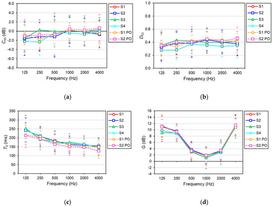 Spatial average versus frequency for each source position (S1–S4 with the closed oculus and S1 PO and S2 PO with the oculus partially open) in the Campo Pequeno bullring: (a) Clarity, C80; (b) Definition, D50; (c) Centre Time, TS; (d) Sound Strength G. The horizontal bars represent the standard deviation.