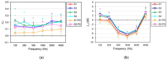 Spatial average as a function of frequency for each source position (S1–S4 with the closed oculus and S1 PO and S2 PO with the oculus partially open) in the Campo Pequeno bullring for the (a) Early Lateral Energy Fraction, JLF, and (b) Late Lateral Sound Level, LJ. The horizontal bars correspond to the standard deviation.