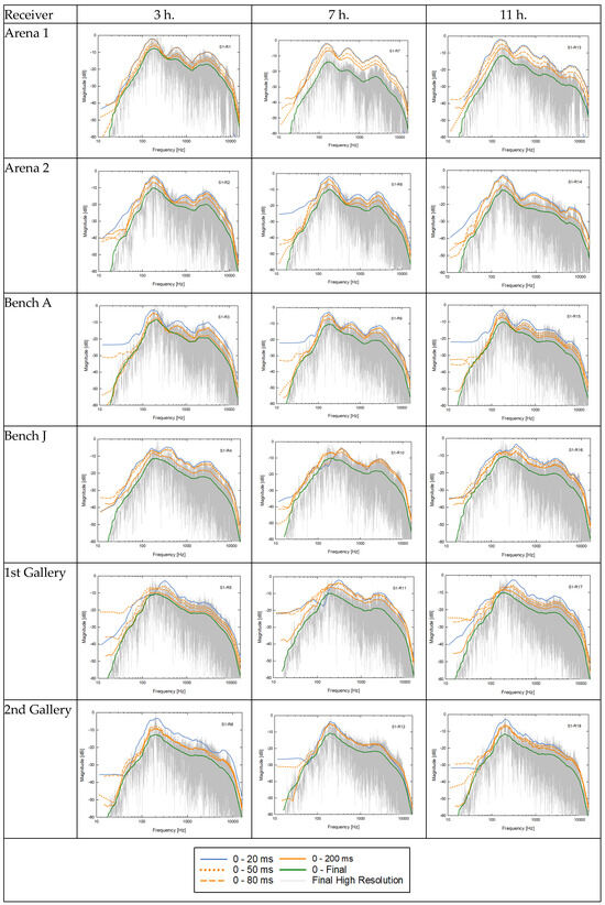 Figure 12 shows the RFR magnitude curves for the 18 combinations between source S1 (centre of the arena) and the six various receiver positions from the arena to the upper galleries and on the three reference axes (3 h, 7 h, and 11 h). Each curve corresponds to time intervals from the direct sound to 20, 50, 80, and 200 ms, as well as the final. The 20 ms limit is associated with the auditory precedence effect; the 50 and 80 ms limits are associated with speech and music Clarity; 200 ms marks the threshold of the initial −5 dB decay used in estimating reverberation time. The cumulative response after 200 ms reflects the energy of the diffuse reverberant field.