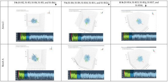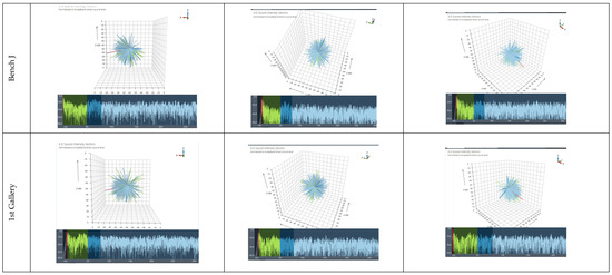 As for the direction of early reflections, the plots in Figure 13 illustrate sound energy arriving at the receiver positions, the same as in Figure 12 (except those closest to the source located in the arena, Arena 1), as a series of vectors or spikes, known as “intensity urchins” on a 3D Cartesian diagram, where the length of each vector indicates level, the angle represents the incoming direction, and the colour corresponds to time of arrival. The four tetrahedral cardioid signals from the TetraMic microphone array are converted into a first-order B-format, which encodes the pressure (omnidirectional) and the three particle velocity signals (figure-of-8) in the X, Y, and Z directions. The filtered B-format impulse response is divided into a series of non-overlapping rectangular windows. The average direction of sound energy flow in each window is determined using a sound intensity technique, which corresponds to the product of pressure and particle velocity. In the measurements studied, a 2 ms time window was used, which restricts the analysis to frequencies of 500 Hz and above, and the vectors were coloured according to the time intervals for speech: 0–2 ms, red; 2–50 ms, green; 50–80 ms, dark blue; and >80 ms, light blue, which coincide with the respective colours of the pressure waveform.