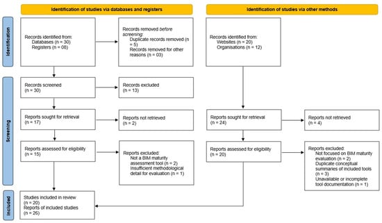 Searches via websites and other organisational sources identified an additional 32 records (20 from general websites and 12 from organisational portals). Full-text retrieval was attempted for 24 records, of which 4 could not be retrieved. The remaining 20 reports were assessed for eligibility, of which 6 were excluded (2 were not focused on BIM/digital maturity evaluation, 3 were duplicate conceptual summaries of tools already included, 1 with incomplete documentation). This process yielded eight additional tools. In total, 20 distinct digital maturity tools and 26 supporting reports were included in the review, consistent with the counts reported in the PRISMA diagram (Figure 1). A detailed breakdown of the search operations, including per-database query strings, date limits, hit counts, and exported records, is provided in Supplementary Table S2.